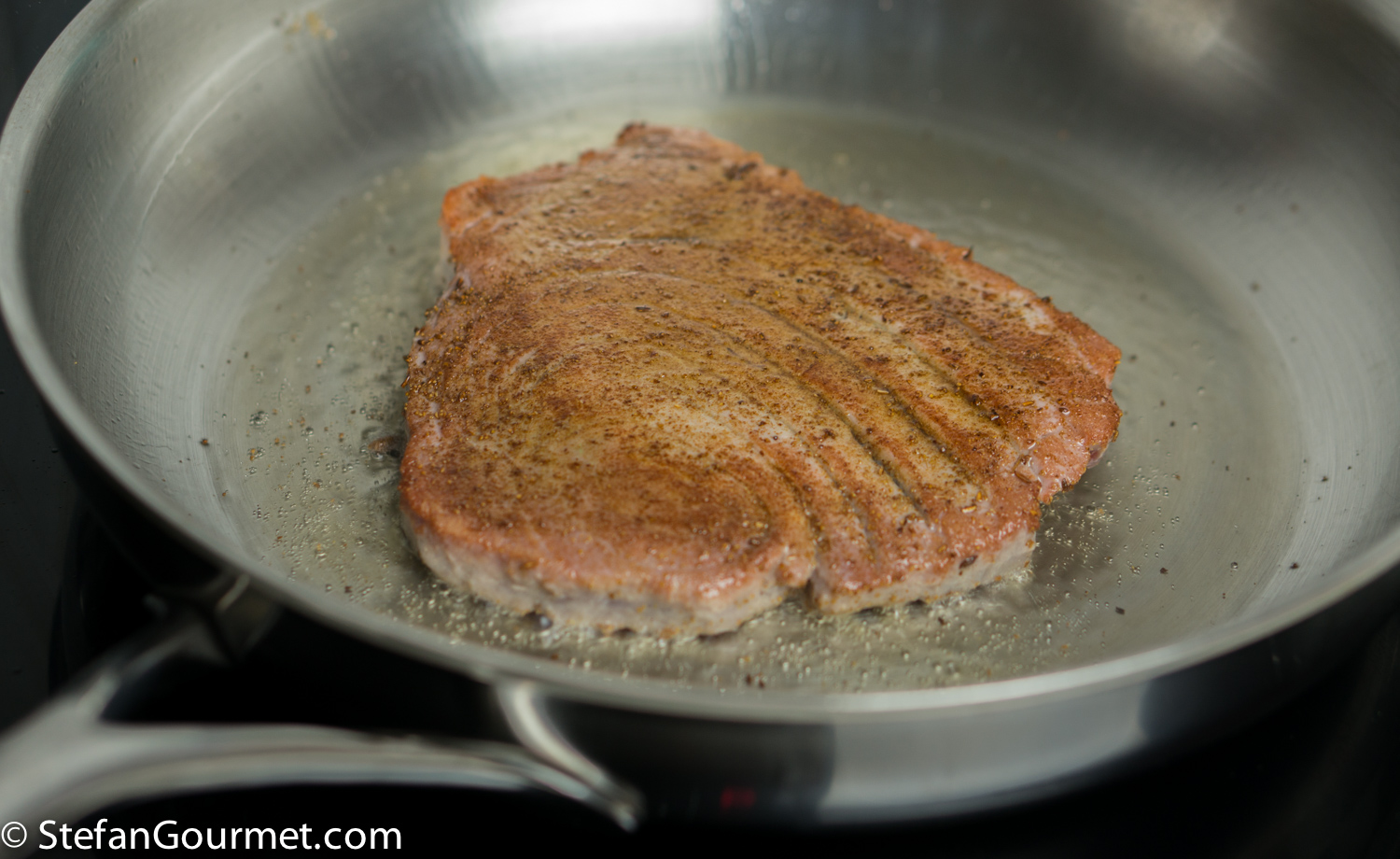 Carefully turn the tuna and cook for about 30 seconds on the other side. Do not overcook the tuna. After searing, cover it with aluminum foil and allow it to rest for about 5 minutes.