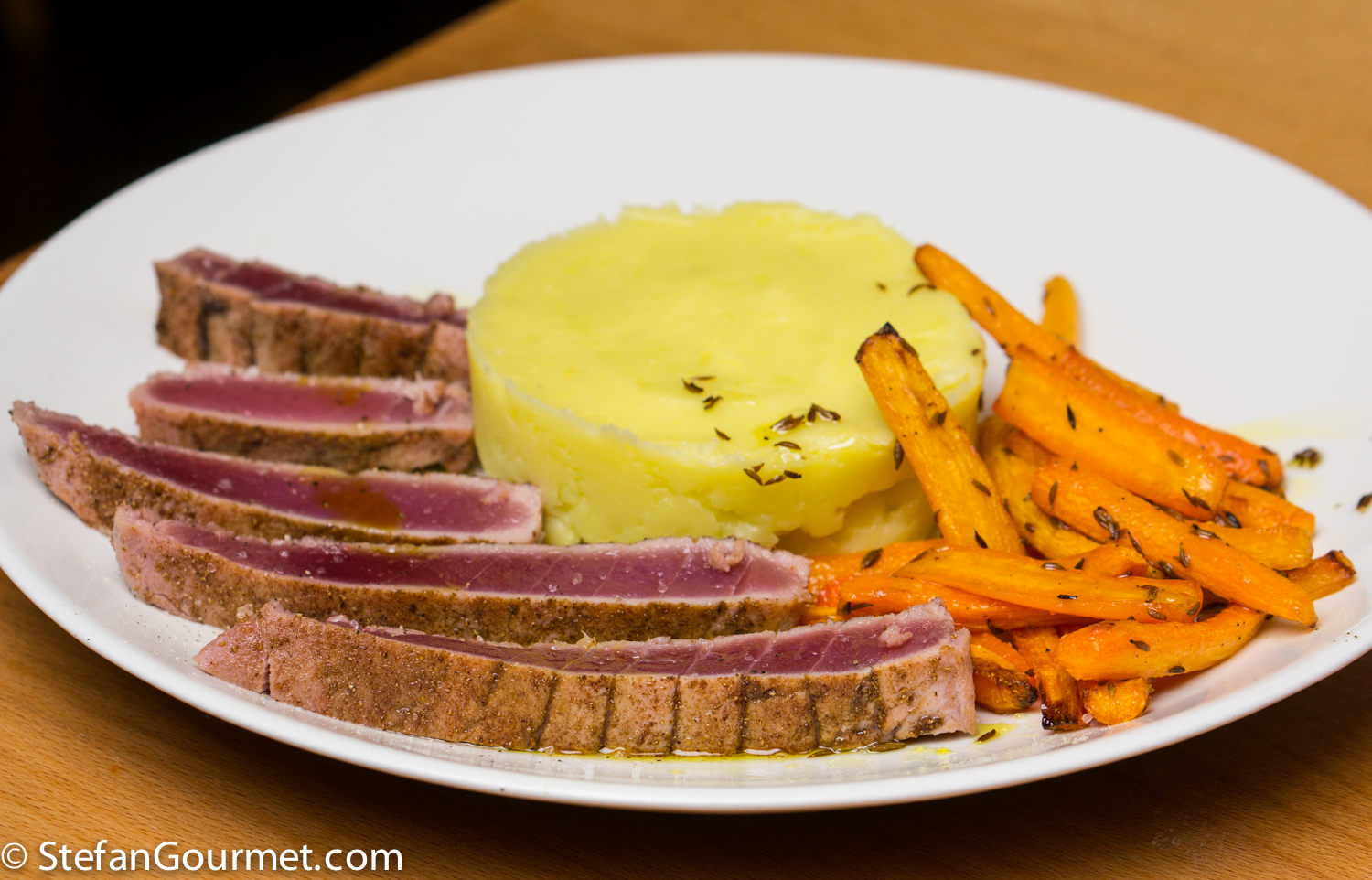 Slice the tuna and serve it with the mashed potatoes and carrots on preheated plates. Season the tuna and carrots with coarse sea salt and freshly ground black pepper.