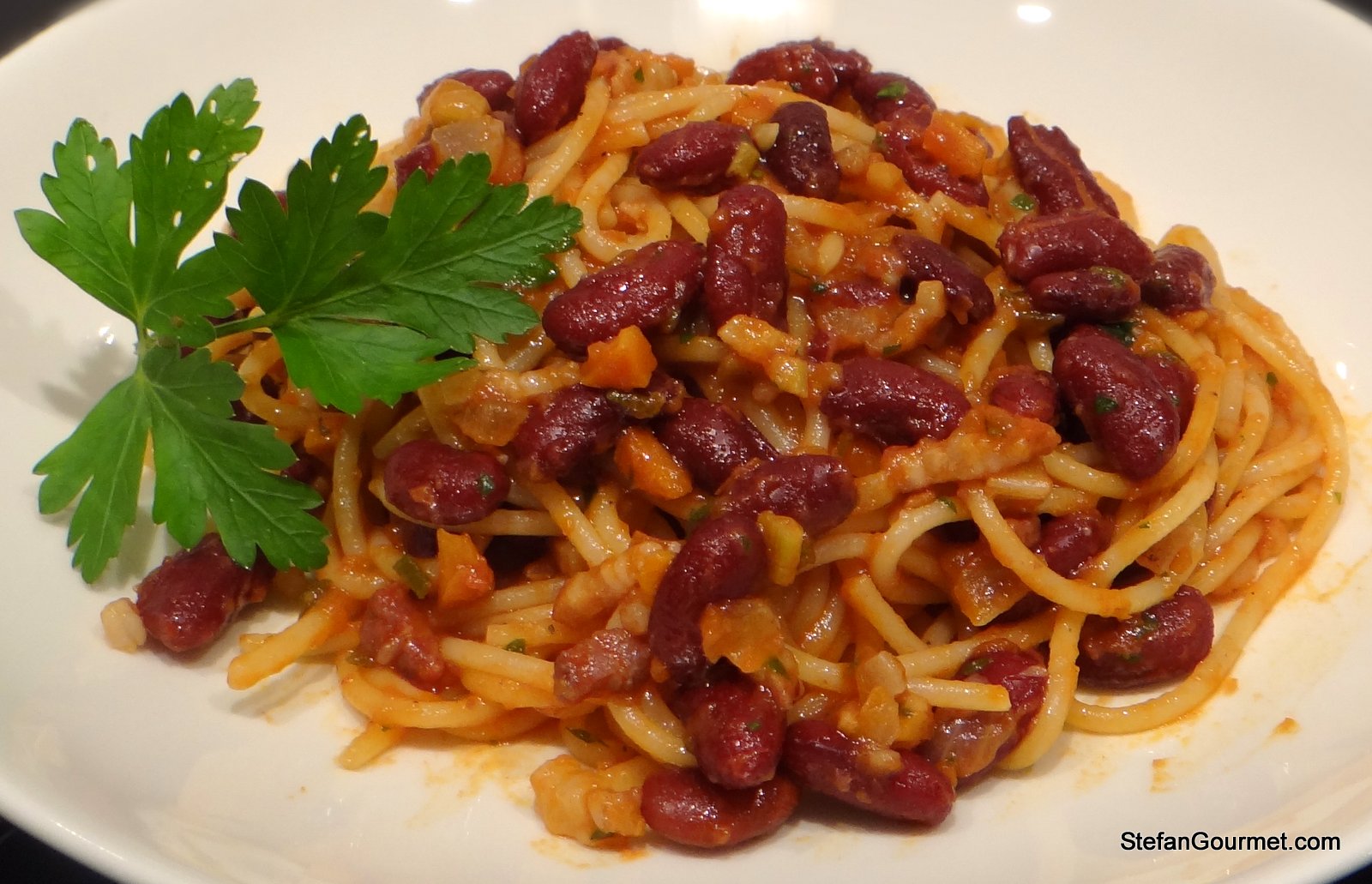 Pasta with stewed kidney beans is a hearty flavorful dish, perfect for winter.