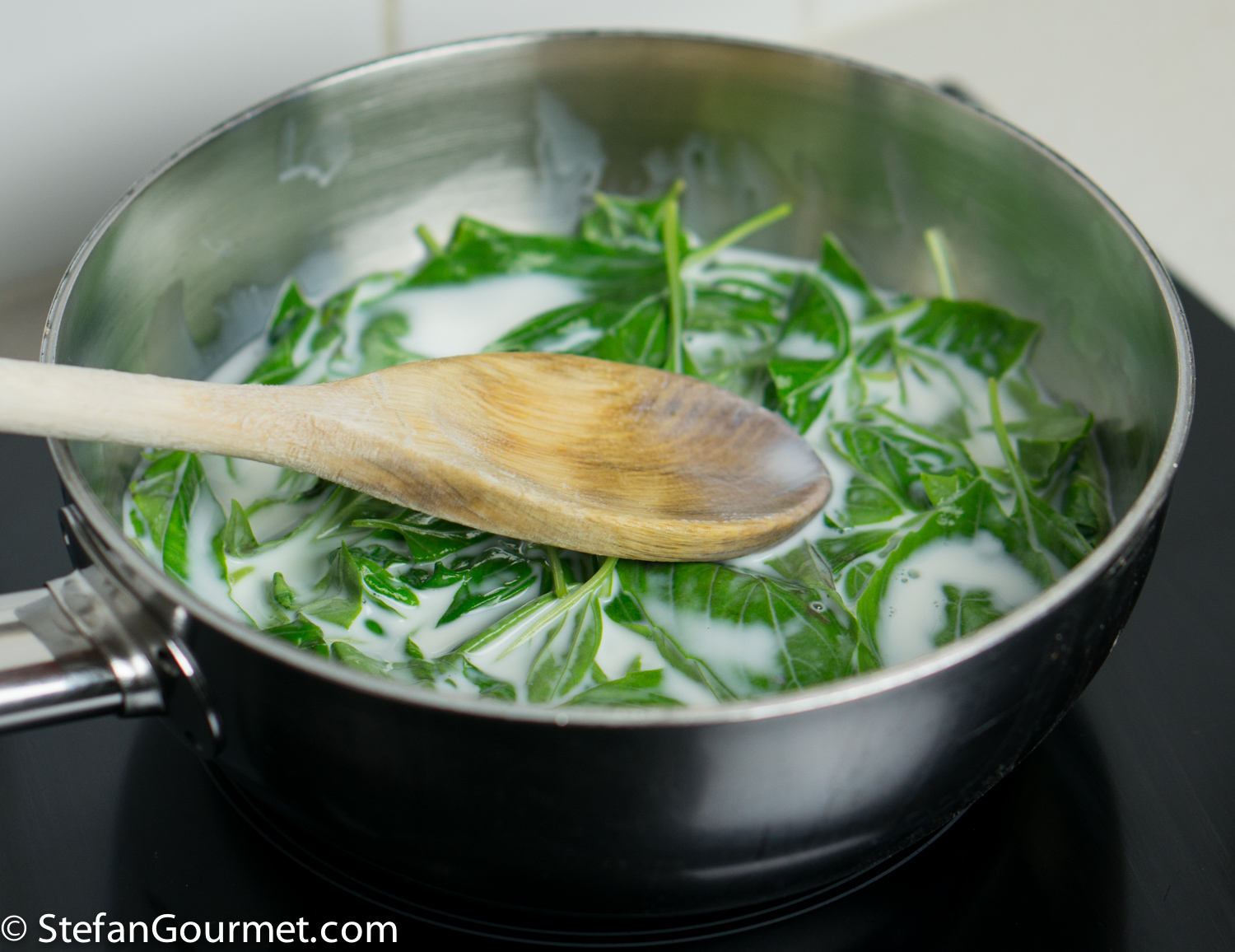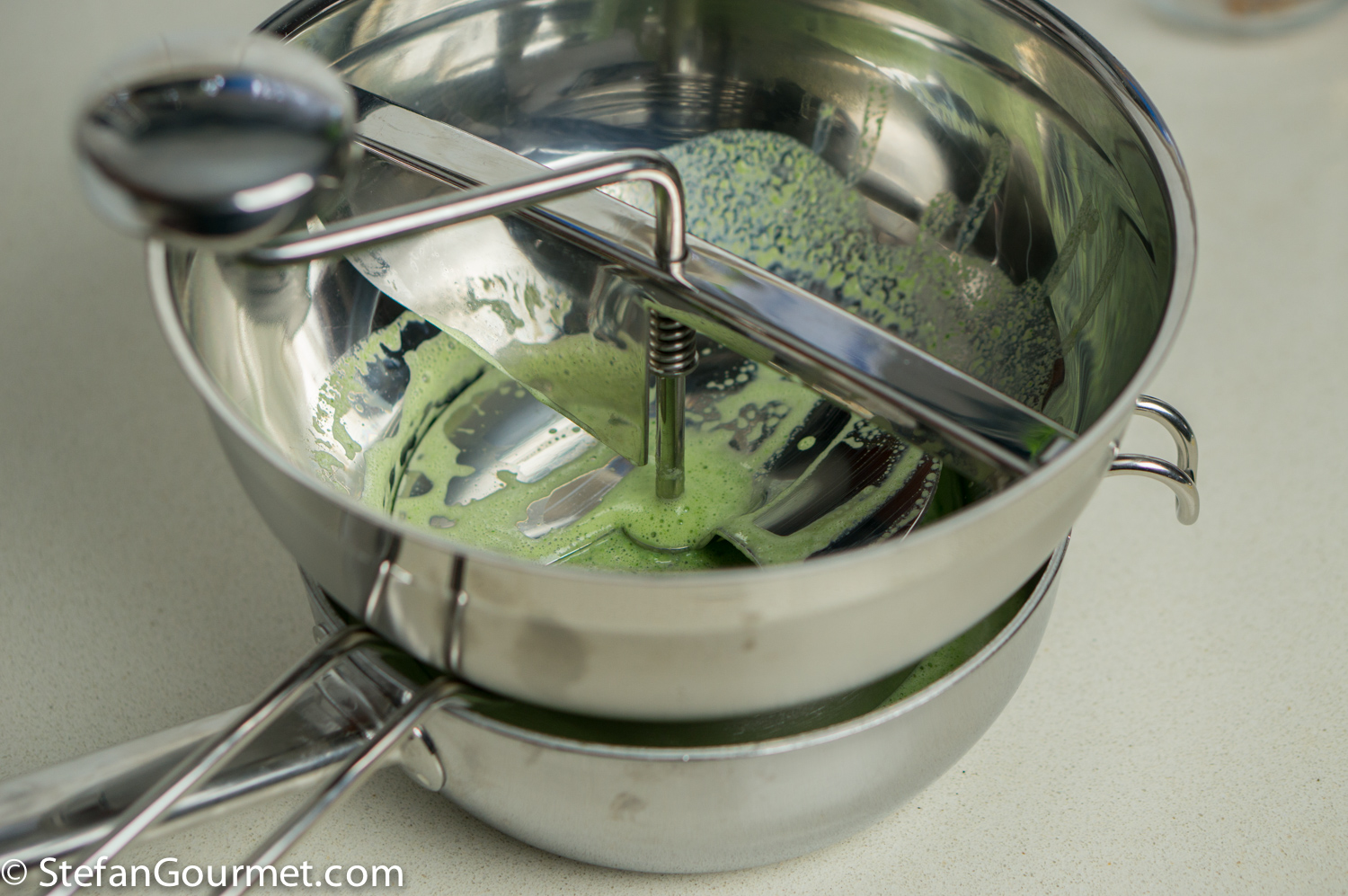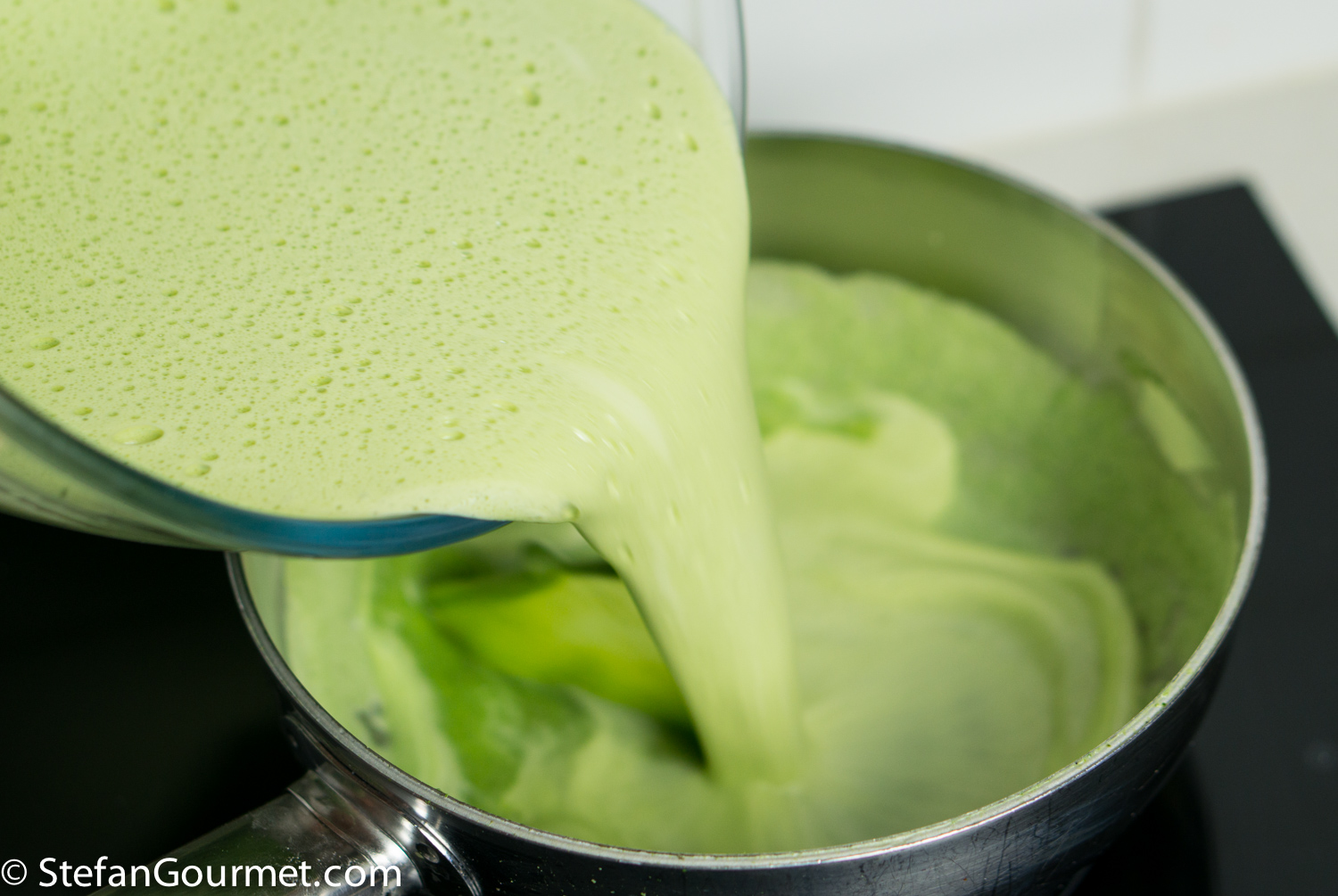 Wash and dry 50 grams of basil leaves. Put them in a saucepan, and cover with 375 ml (1 1/2 cups) of whole milk.