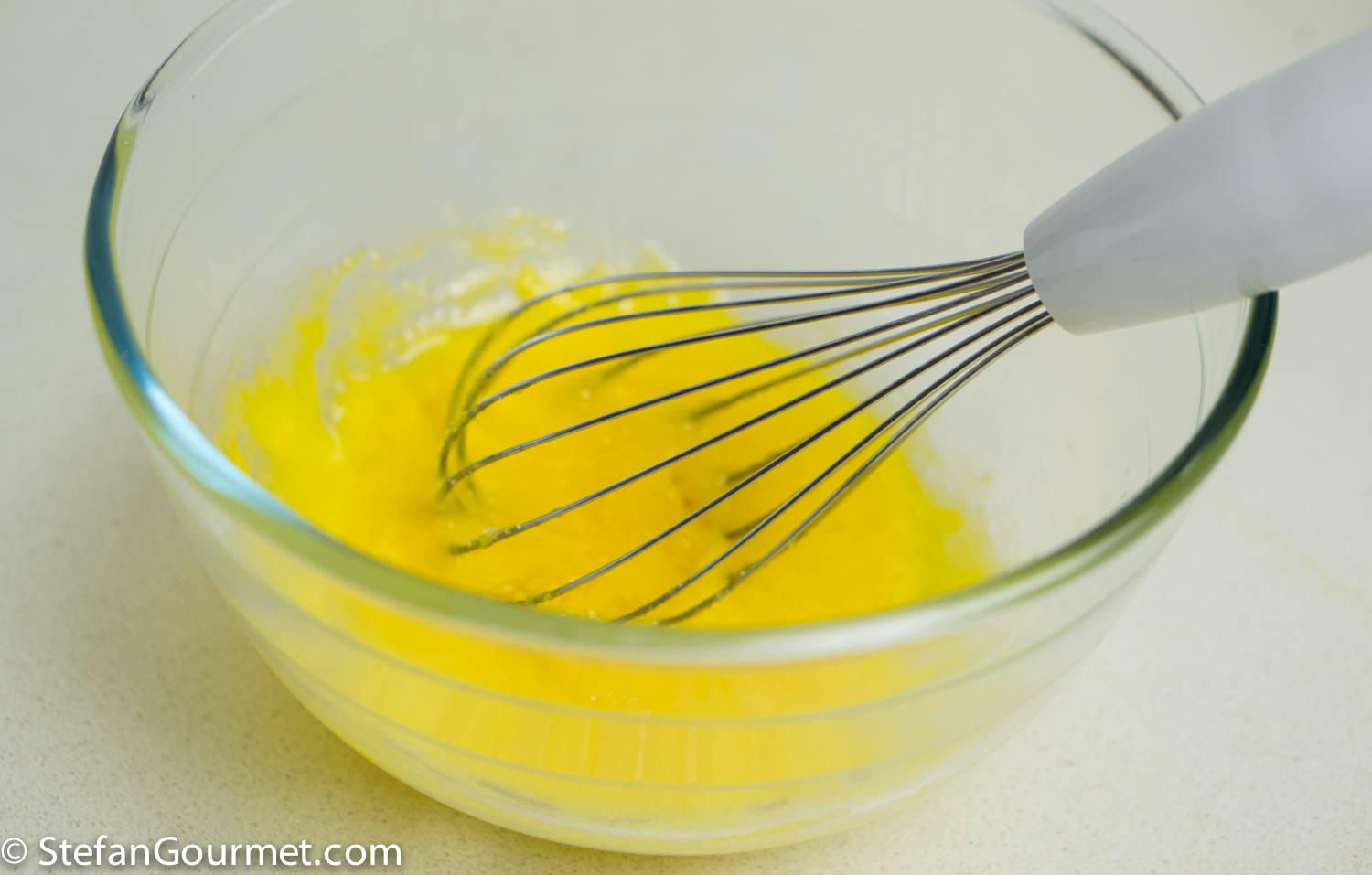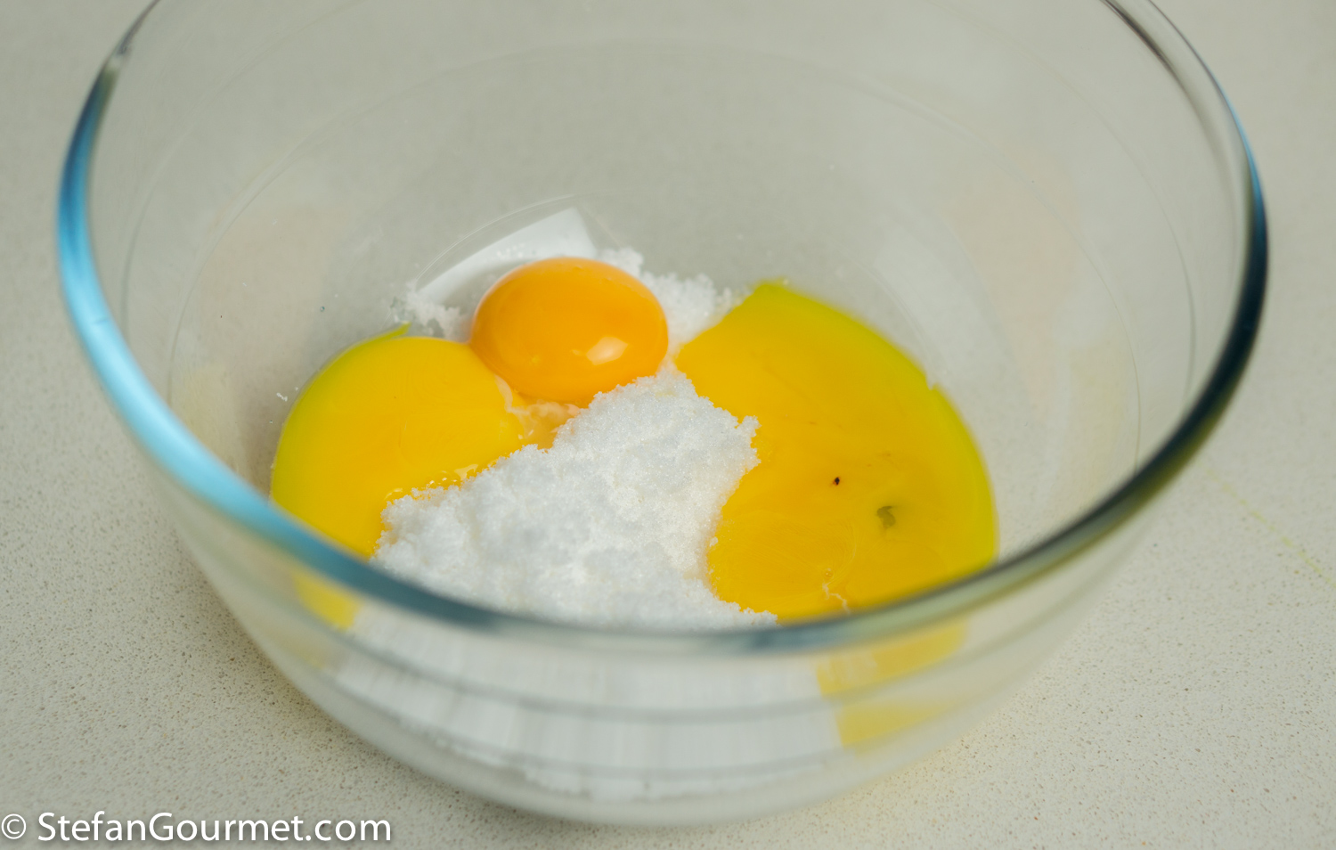 Combine 100 grams (1/2 cup) sugar in a bowl with 4 egg yolks.