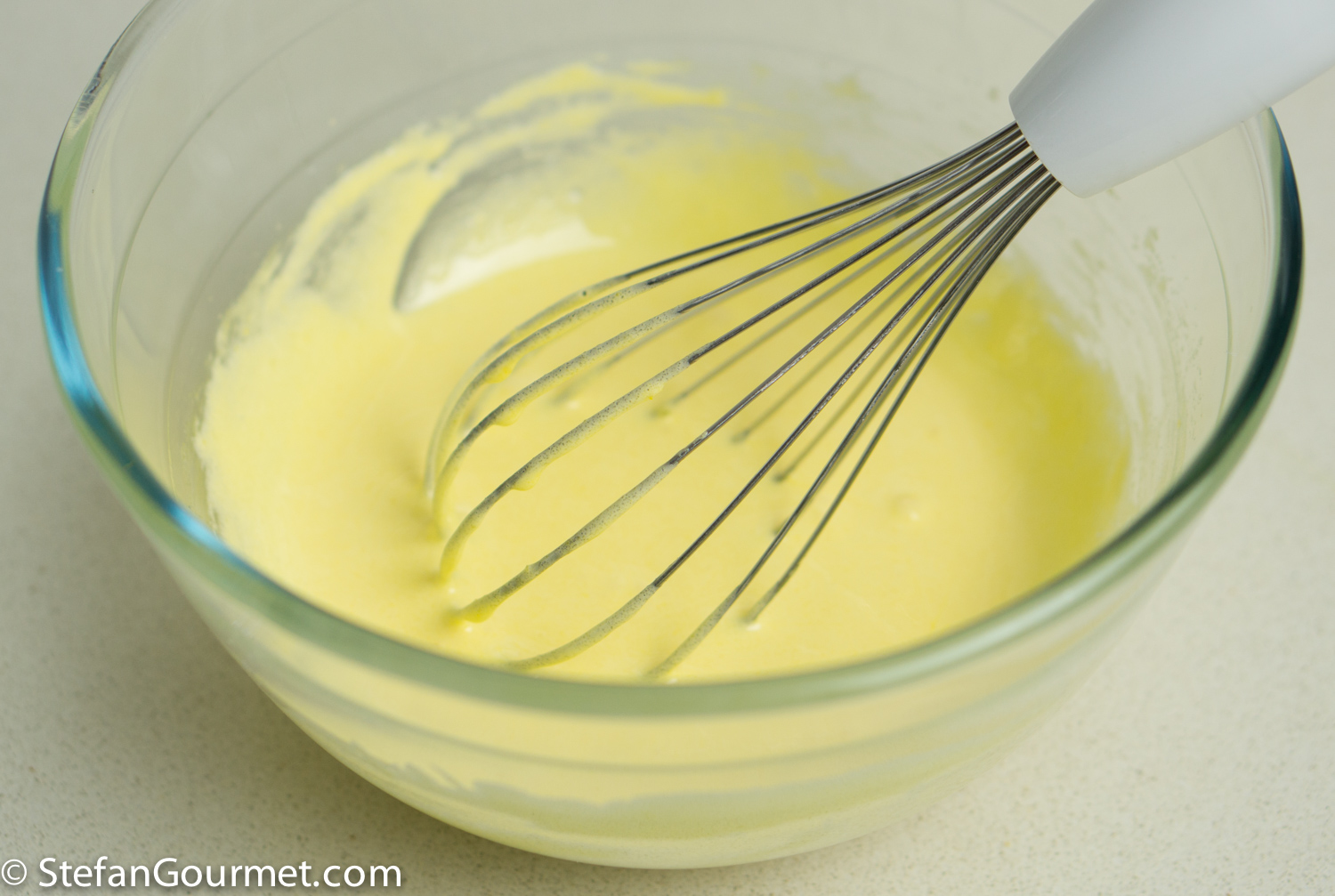 Heat to about 85C/185F over medium high heat, while stirring constantly. I like to use a thermometer with a probe, as it allows me to heat the mixture quickly without the risk of bringing it to a boil (we don’t want that to happen as the eggs would curdle). If you don’t use a thermometer, you could also stir over medium low heat until the mixture coats the back of the spoon. That will take a lot longer and I am not a very patient person.