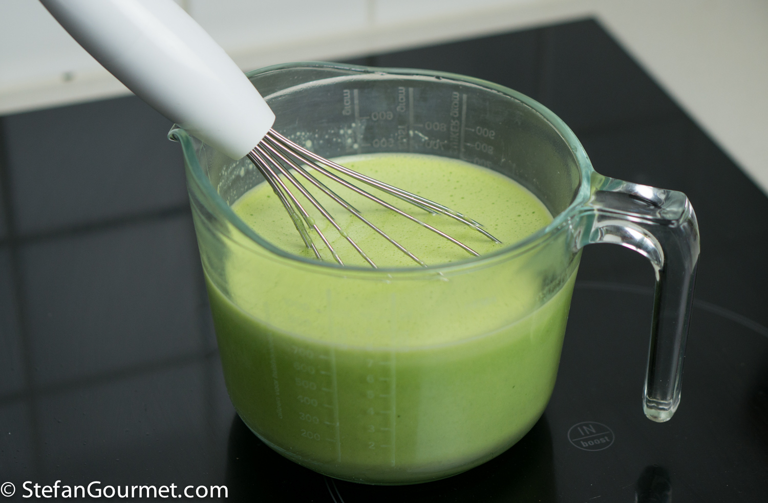 Now add the basil-infused milk to the egg yolk and sugar mixture, and whisk to mix.