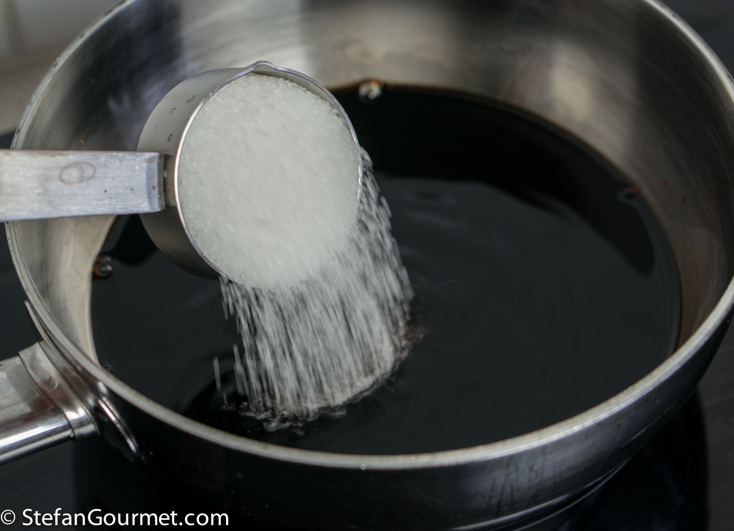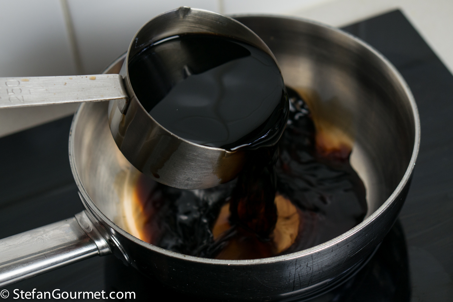 Simmer the mixture until it is thick and syrupy and reduced to about 125 ml (1/2 cup). Take into account that the syrup will become thicker and may even harden as it cools. If the syrup becomes solid when it cools off to room temperature, add a bit of balsamic vinegar and stir over low heat to loosen up the syrup and mix in the balsamic you just added. Allow the balsamic syrup to cool to room temperature. (Store any leftover balsamic syrup in the refrigerator in a covered container. It will keep for a long time.)