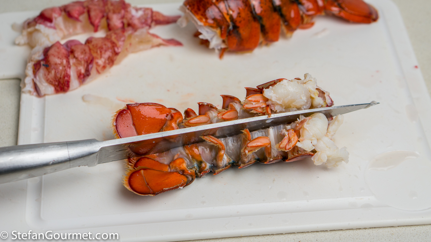 Meanwhile, take the lobster meat out of the tails. Since I was doing 4 small portions, I simply used a chef knife to cut each tail in half lengthwise.