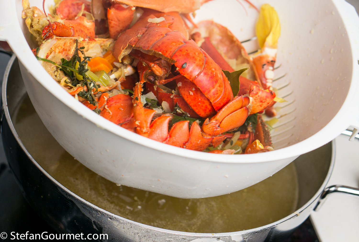 Put the carrot, onion, and celery in the hot water in which the lobster was steeping. Add the lobster shells, a bay leaf, a sprig of parsley, a sprig of thyme and 1/2 teaspoon of black peppercorns.