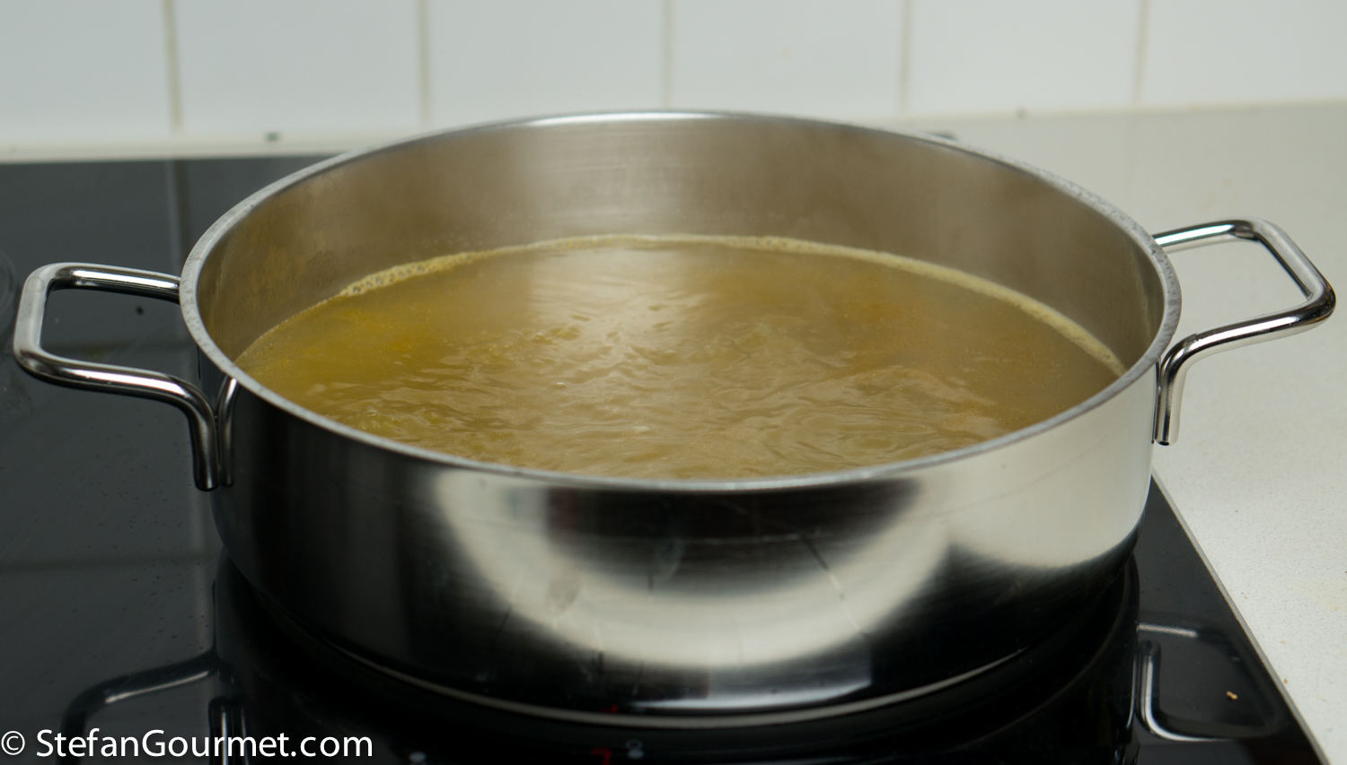 Simmer the stock until has been reduced to about 700 ml (about 3 cups).