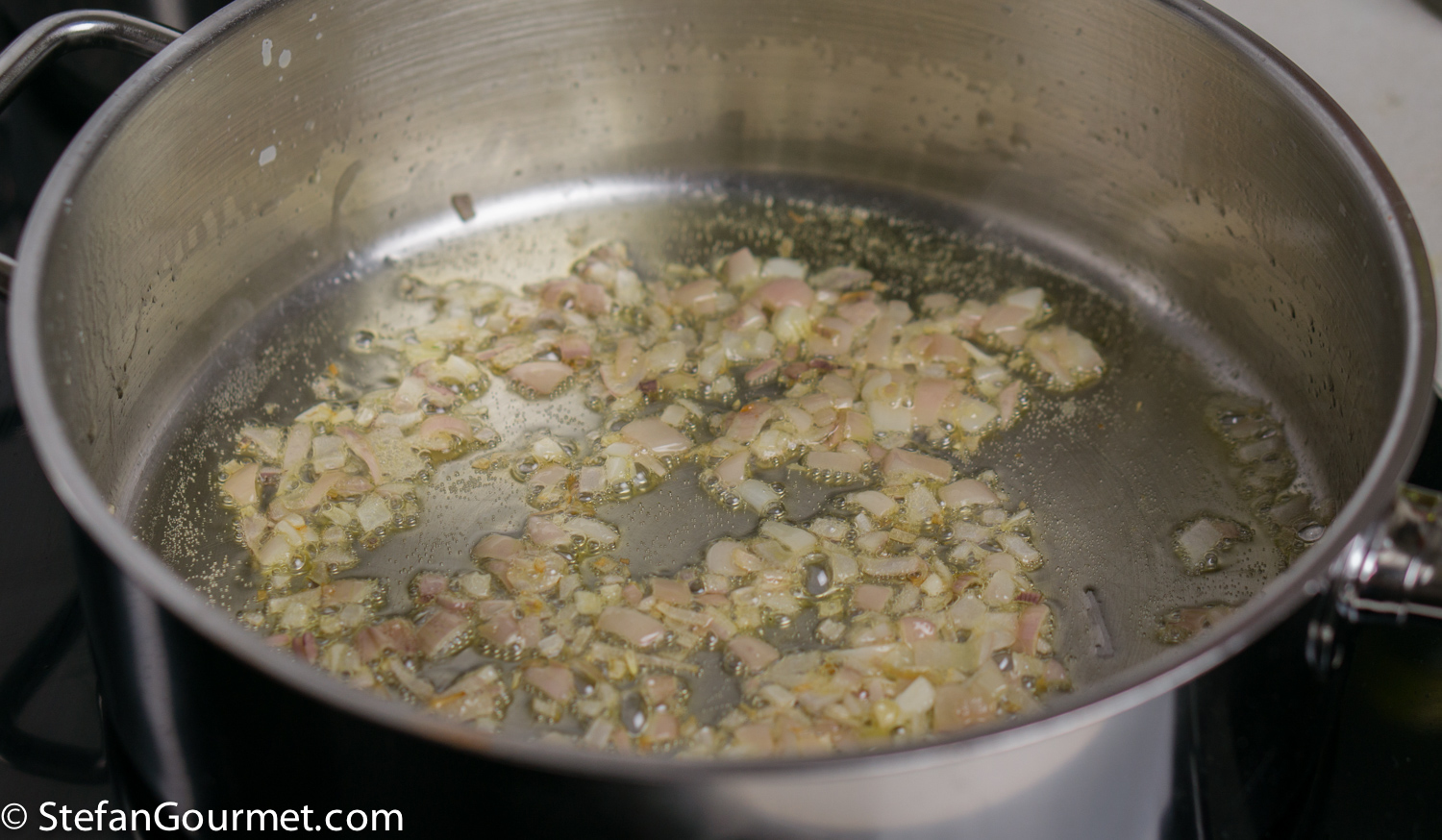 To start making the risotto, melt 2 tablespoons of butter in a wide thick-bottomed pan. Add a mince shallot and stir over low heat for a couple of minutes until the shallot is translucent.