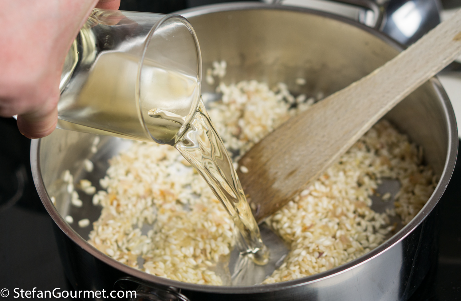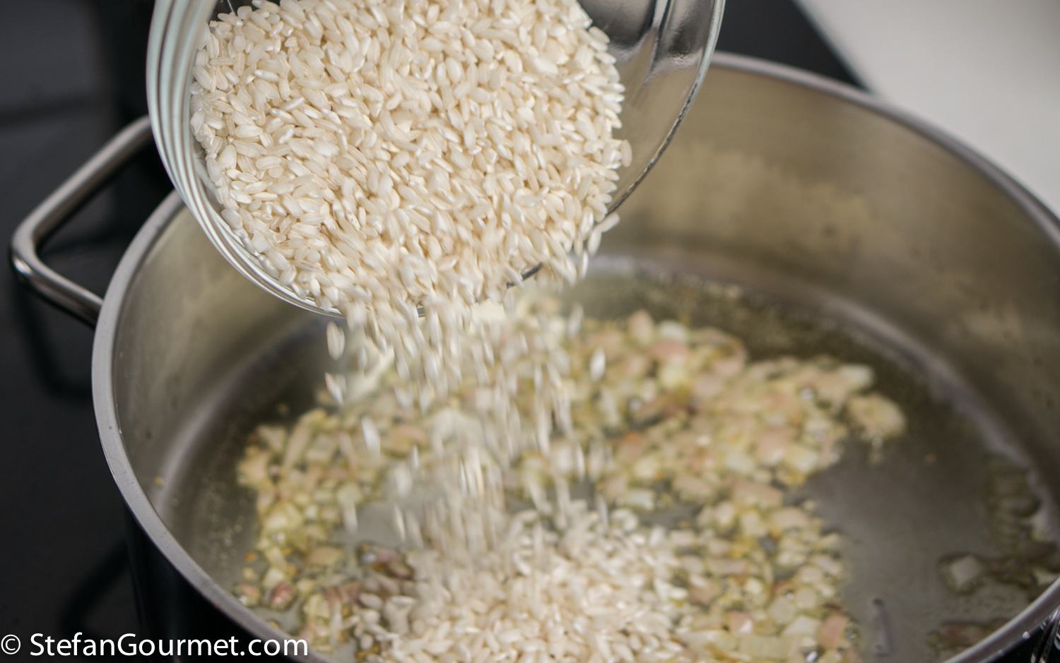 When the shallot is translucent, add 130 grams (2/3 cup) risotto rice.