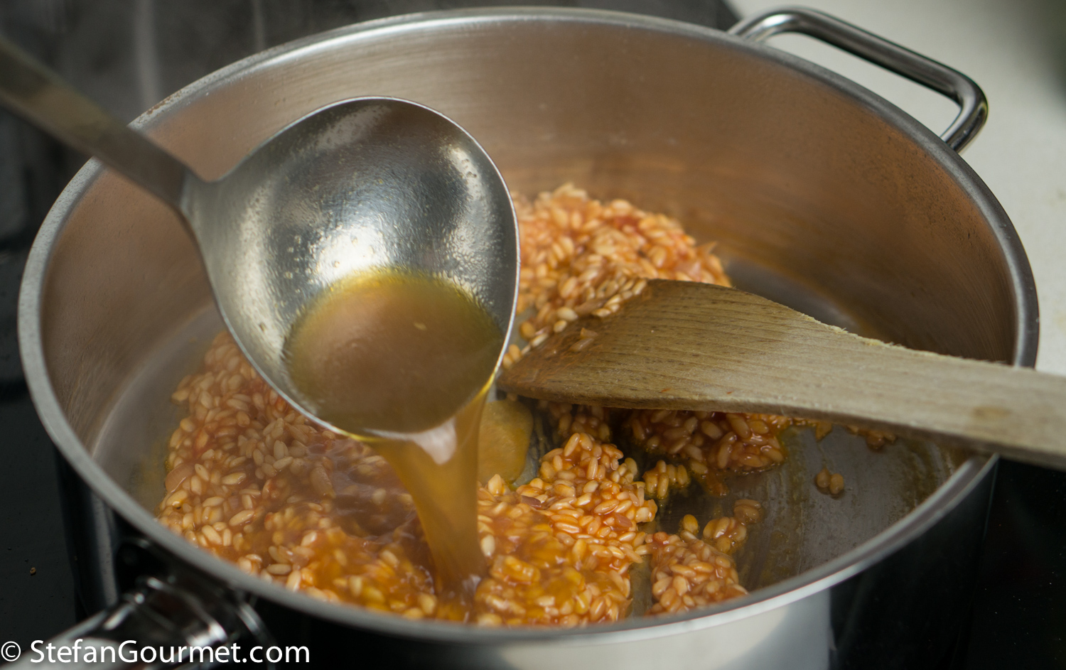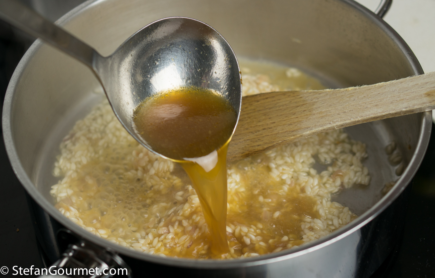 Add a ladle of hot stock. Stir over medium heat until the stock has been absorbed by the rice. As soon as it has been absorbed, add another ladle of stock. Keep stirring and adding stock until the rice is cooked al dente, about 15-18 minutes.