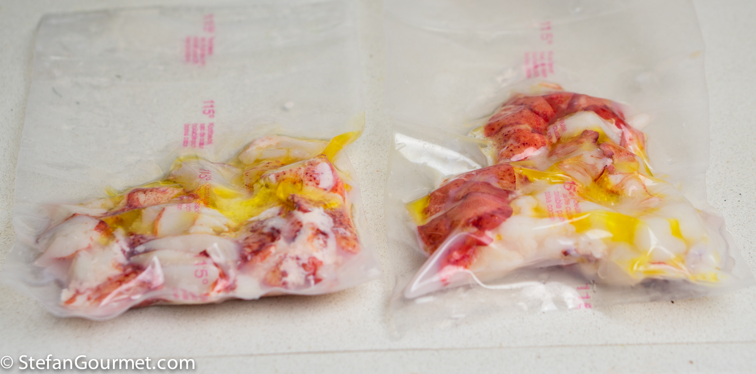 If using sous-vide, vacuum seal the lobster tails and lobster claw meat with a tablespoon of butter, and refrigerate.