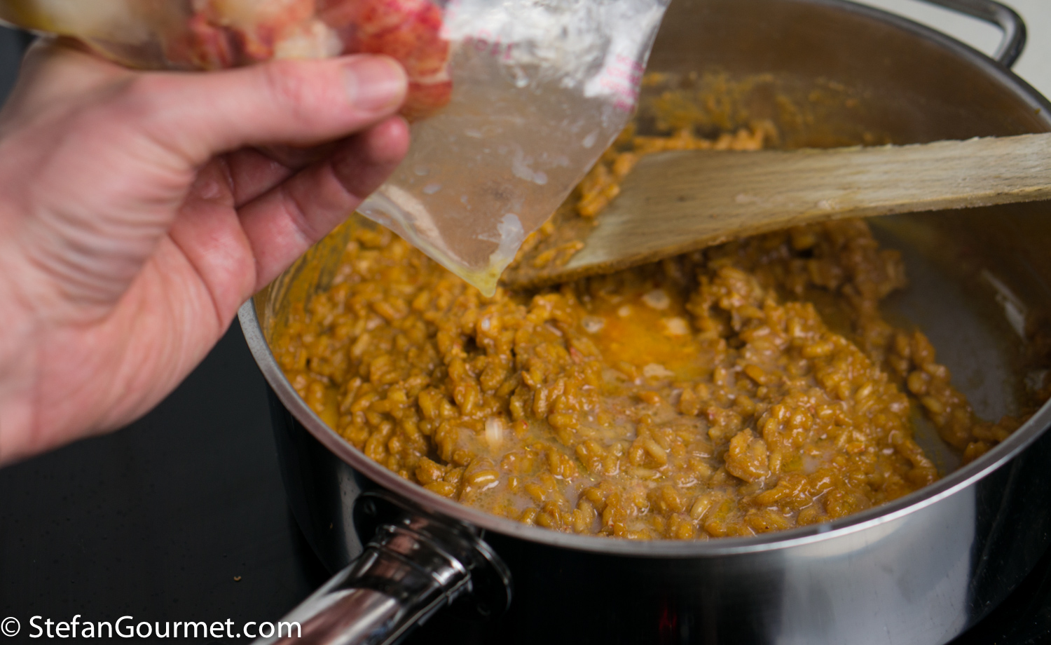 Cut the bags open and pour the butter and lobster juices into the risotto.