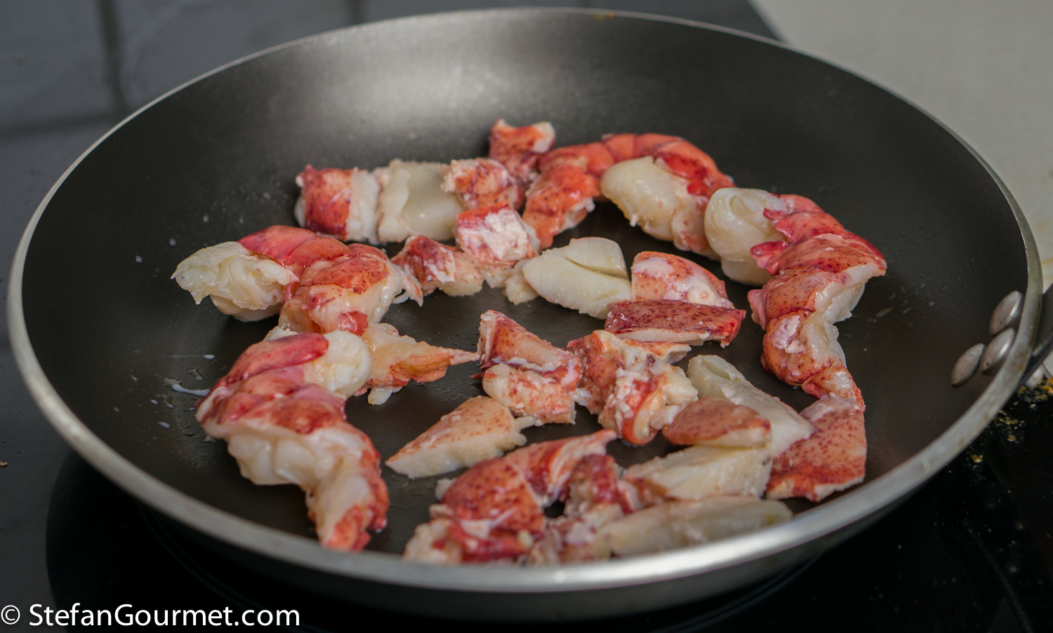 Heat up the lobster pieces in a non-stick frying pan over medium heat. (You could also heat them up on top of the hot risotto. That is in fact preferable when not using sous-vide, as heating them up in the frying pan from the refrigerator will dry out the lobster too much.)