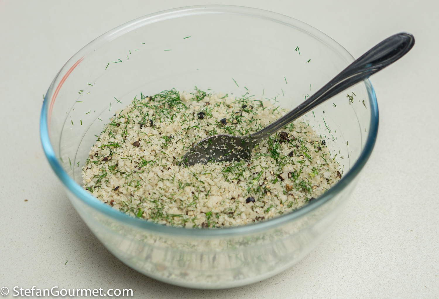 Combine the ingredients to cure the salmon (salt, sugar, dill, juniper berries, peppercorns) in a bowl.
