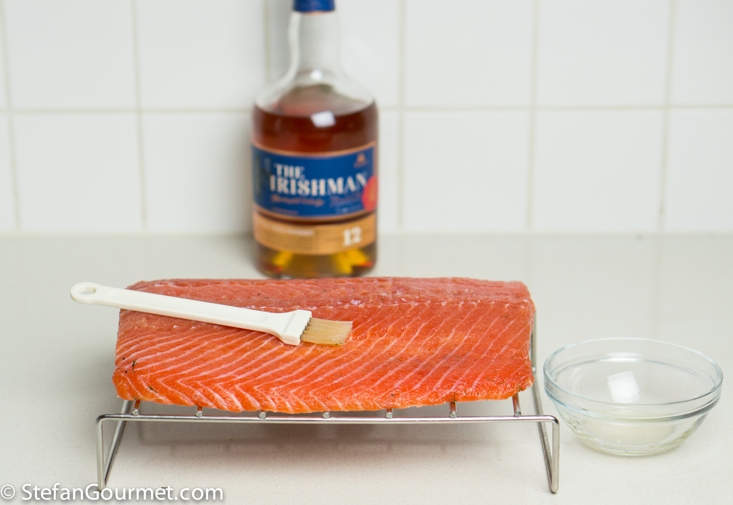 Brush the salmon with 2 tsp of whiskey. Allow to dry for 3 hours in the refrigerator, then brush on more whiskey. And repeat, for a total of three times of brushing whiskey onto the salmon.