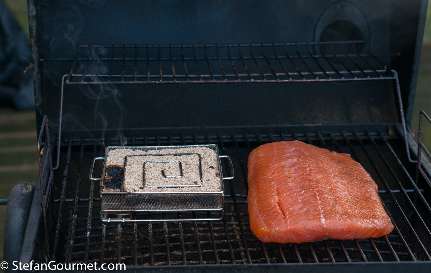 Fill up a cold smoke generator with sawdust and light it. Put it in a suitable place (a grill with a cover is perfect) together with the salmon.