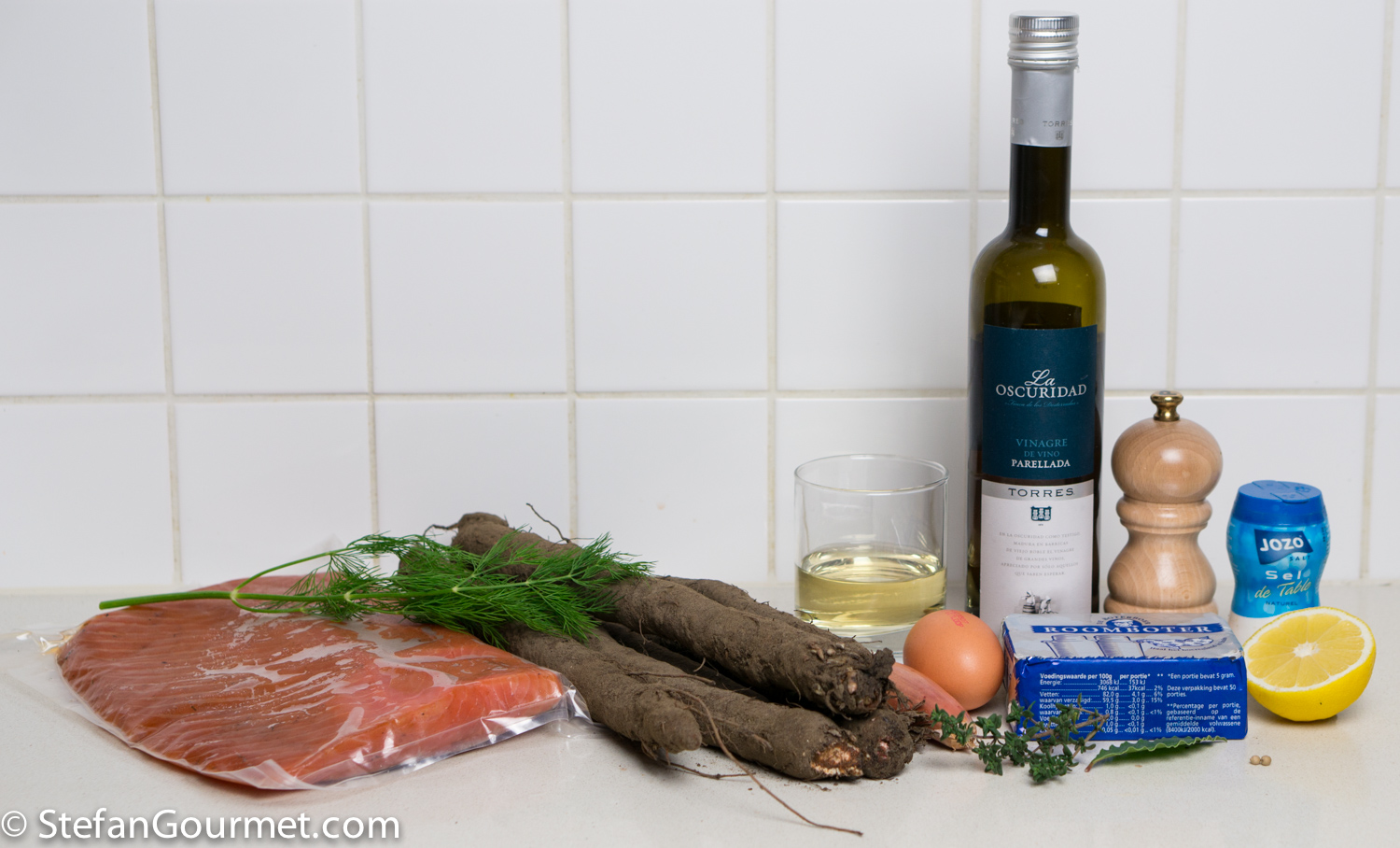 But then I had to thought of a dish to serve it with. The first that came to mind was to serve it with asparagus, but those are well out of season. It was only a small step from asparagus to salsify, the winter version of asparagus. I thought it would be nice to make a dill sauce to go with the salsify and salmon, and decided on a hollandaise with dill (which is the same as a béarnaise with the tarragon replaced with dill).