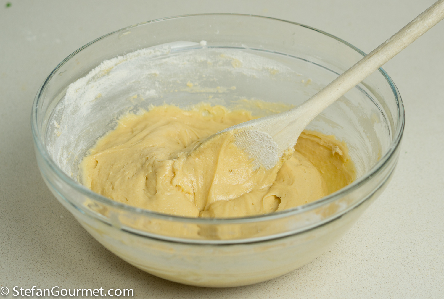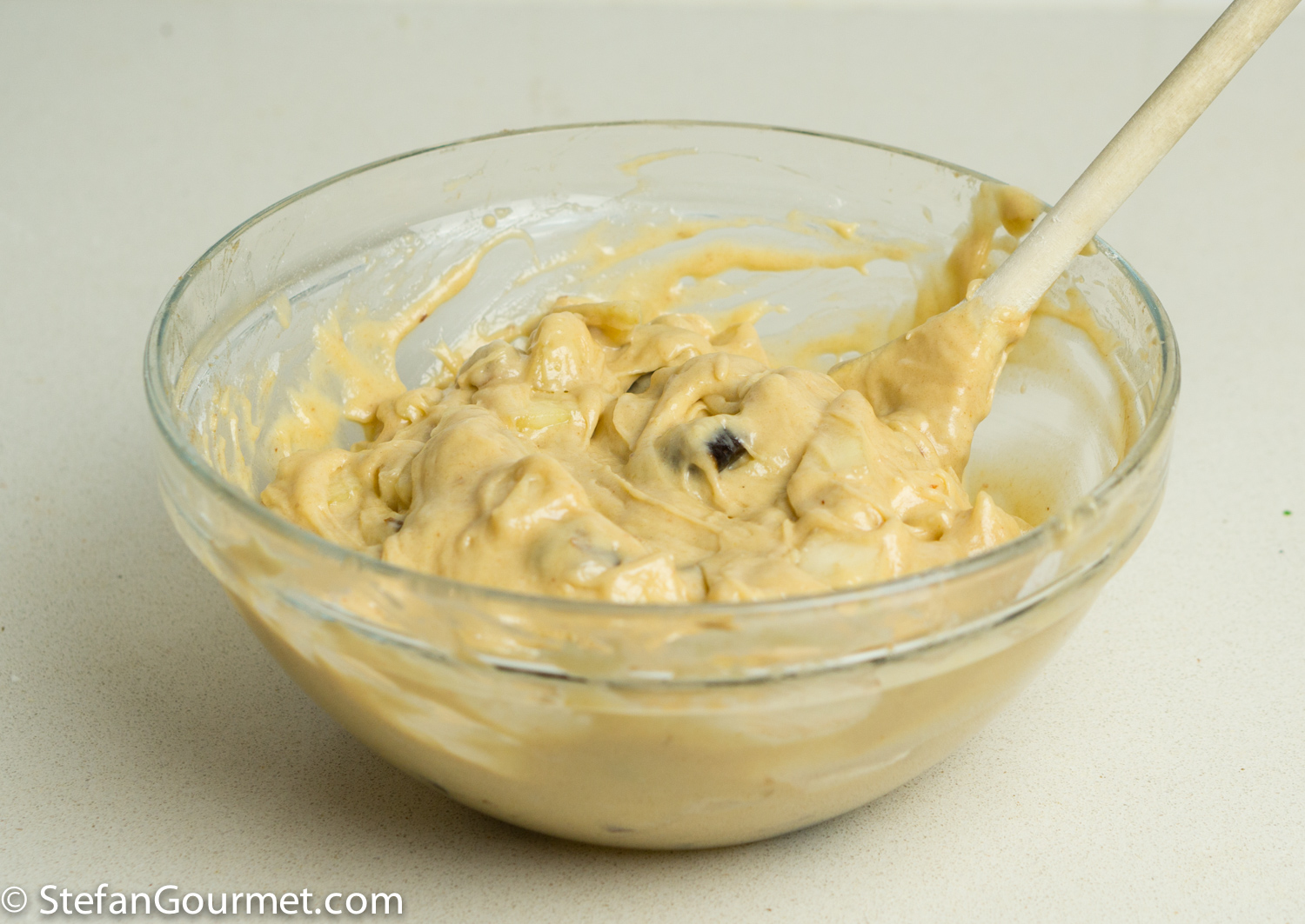 Chop the dates and put them in a bowl. Peal and core 2 pears and cut into chunks, add to the same bowl. Add 80 ml (1/3 cup) of cognac, stir, and allow to macerate for half an hour while you make the batter.