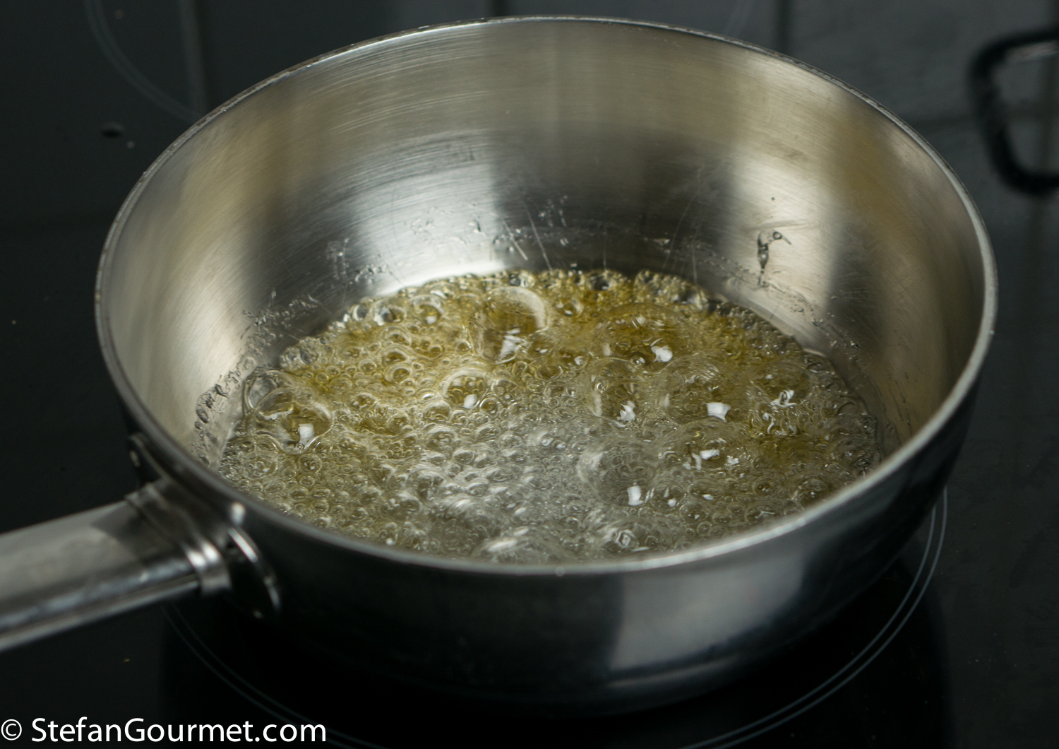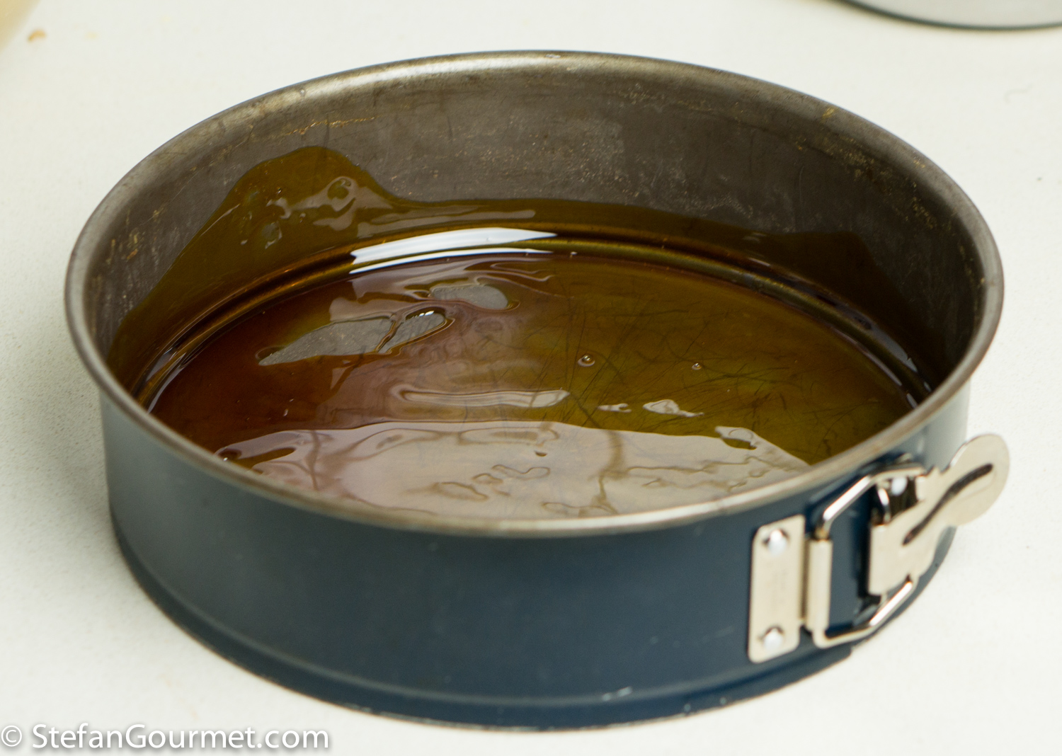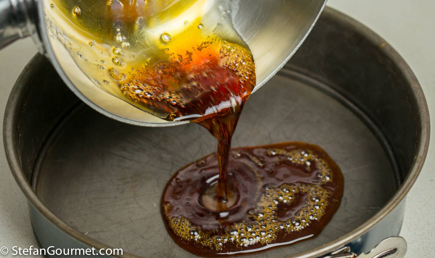 Tilt the pan to coat the bottom and the sides with the caramel. I wasn’t quick enough, so I didn’t do a very good job. That’s what you get for trying to photograph everything as well!