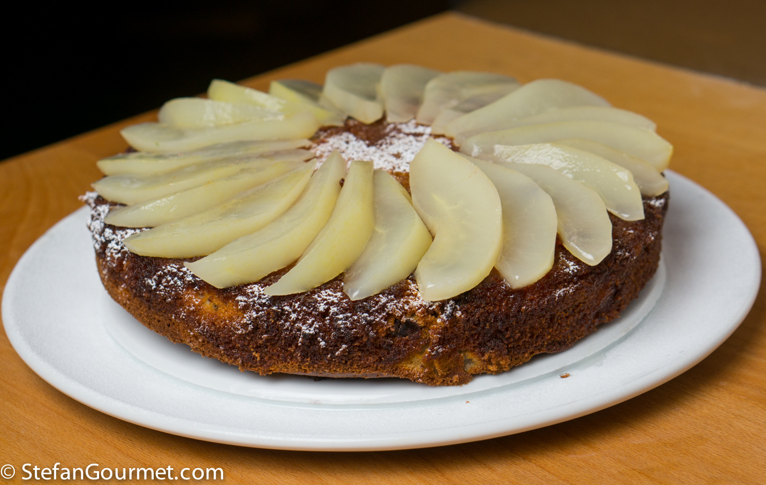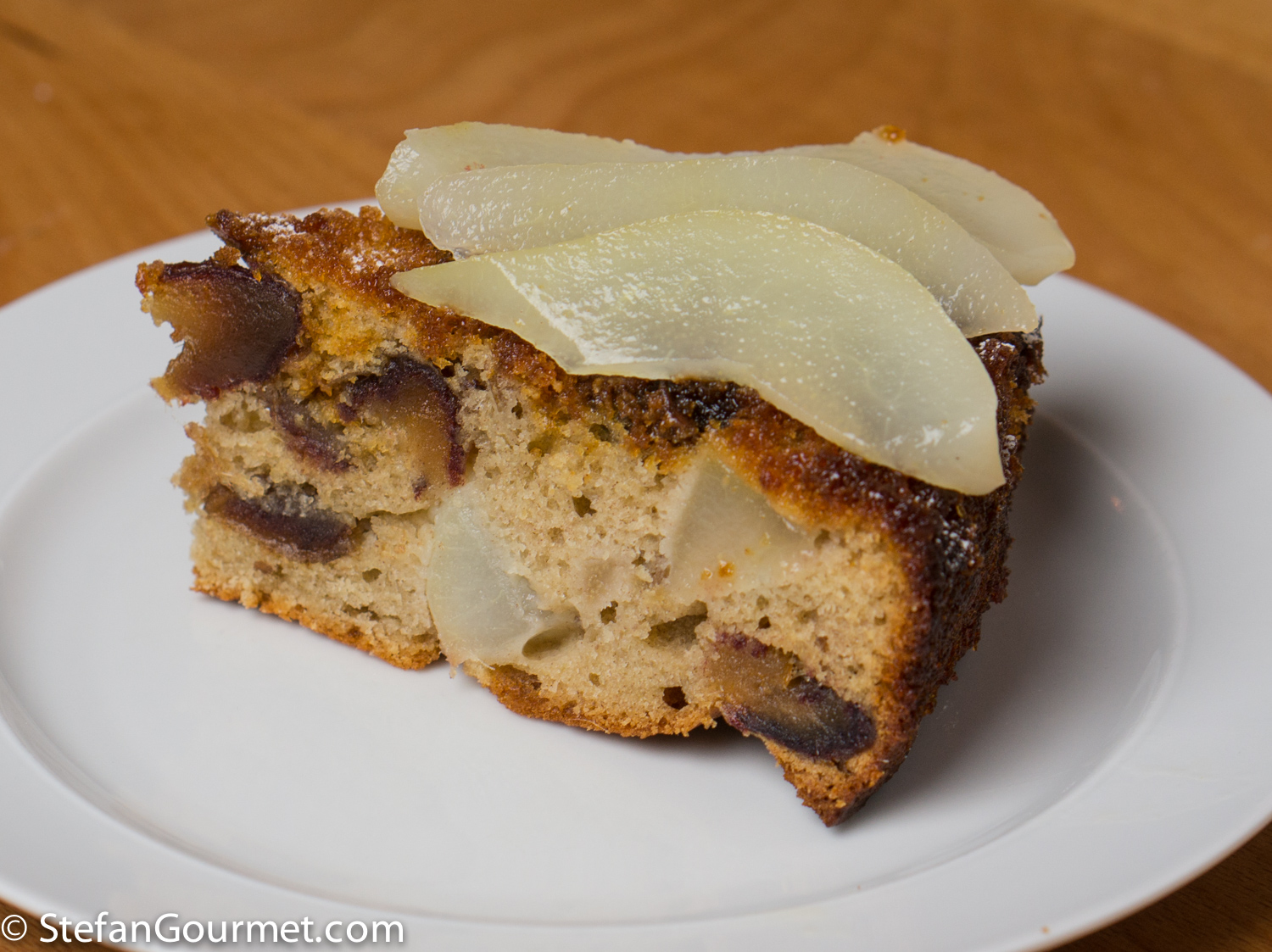 The recipe for this cake with pears and dates is from Tuttacronaca, an Italian blogger who has unfortunately stopped blogging. It has some similarities to the sticky date pudding I posted recently, as it also has dates, caramel, and cognac. The addition of pears freshens up the dessert, and leaving out the caramel sauce also makes it lighter.