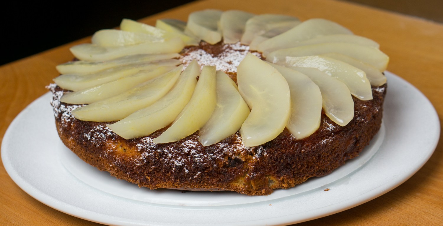 Sprinkle the cake with icing sugar. Peel and core the remaining two pears, and slice them. Rub lemon juice on the slices to prevent them from discoloring. Arrange the pear slices on top of the cake.
