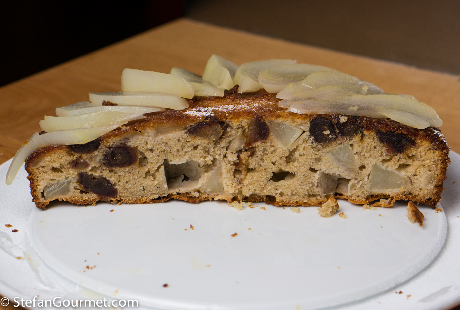 The pears go on top as well as in the cake, together with the dates. The cake tin is lined with caramel for some additional flavor. That is the only tricky part of the recipe, as caramels are always difficult to work with.