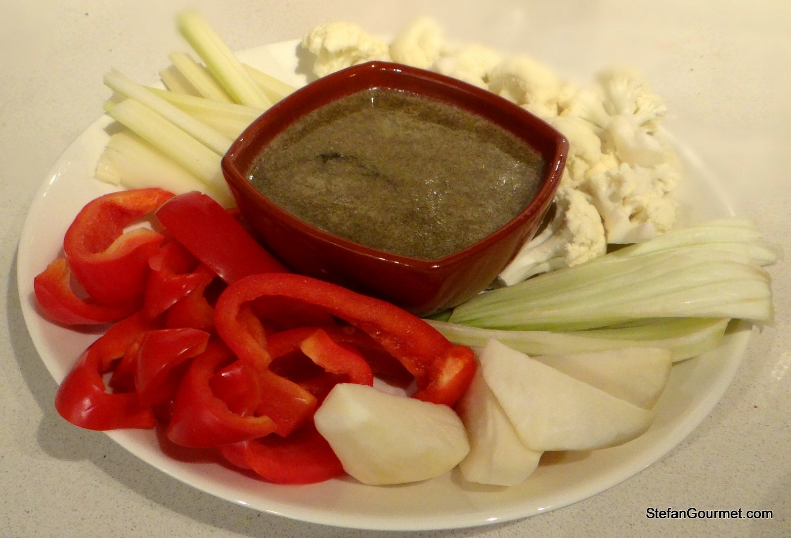 Bagna càuda is a warm dip sauce from Piemonte, made with olive oil, anchovies, and garlic and served with raw or cooked vegetables to dip.