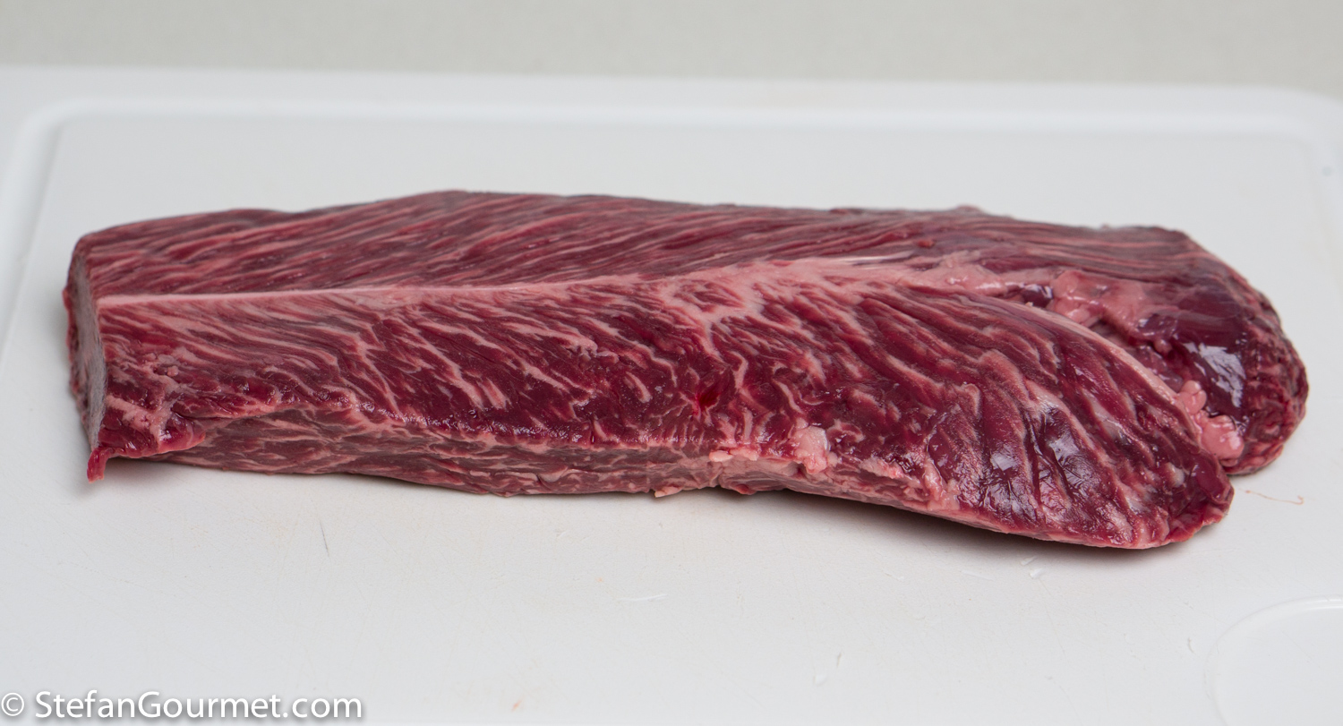 I started with a beautiful piece of wagyu hanger steak from local wagyu farm Het Koeienhuis. Hanger steak is a so-called ‘butcher’s cut’, a lesser known cut (in Dutch: longhaas, in French: onglet) that has a lot of flavor and can be prepared as a steak if done correctly. This means slicing it against the grain, and removing the membrane that runs through the center. It is still a bit tough when prepared like a steak. You can fix this by cooking it sous-vide for 4 hours at 55C/131F, which will tenderize the meat just enough by keeping it medium rare. (If you use beef tenderloin instead, you can skip cooking it sous-vide and go straight to the freezing part. Please note that beef tenderloin is much more tender than hanger steak, but has far less flavor. And it is more expensive.)