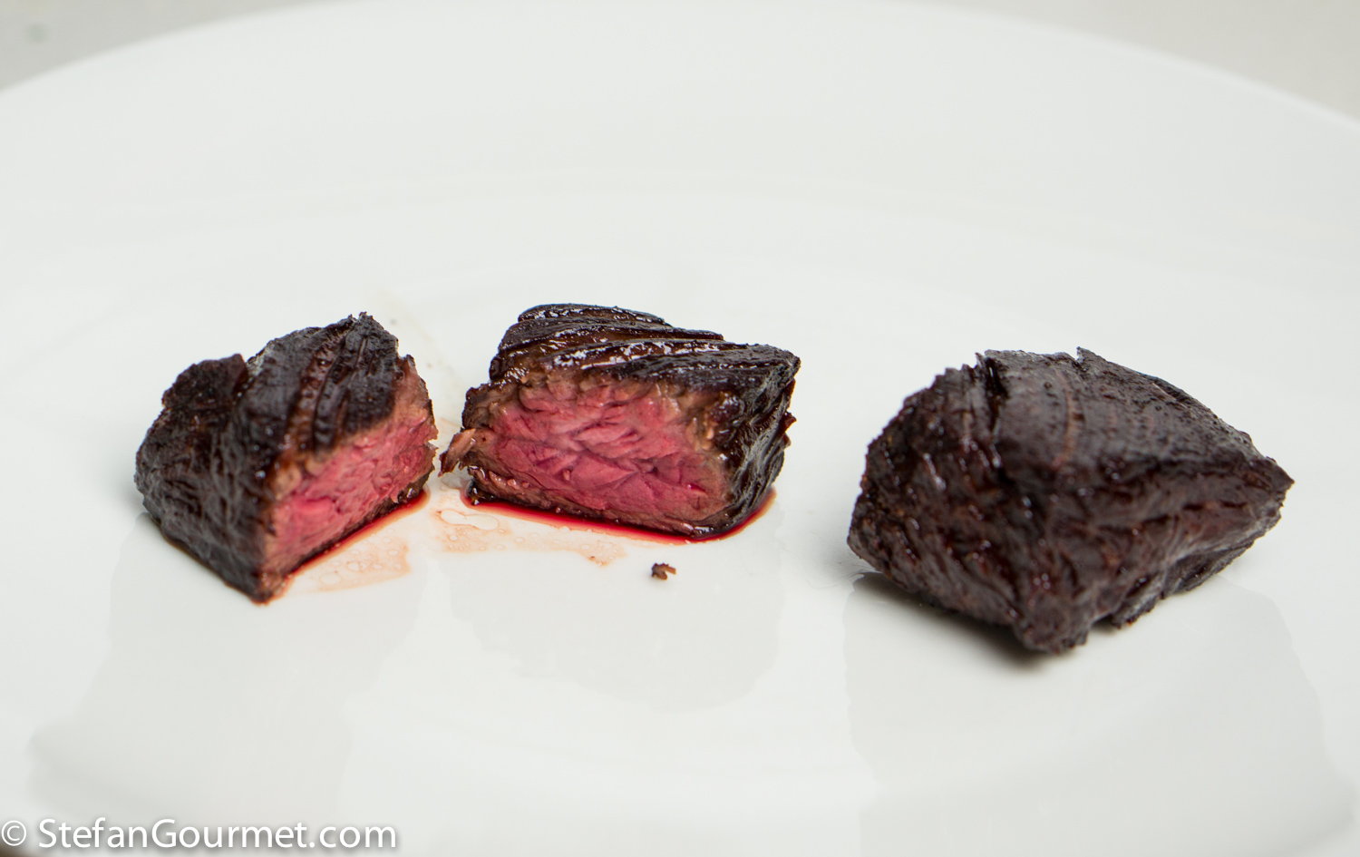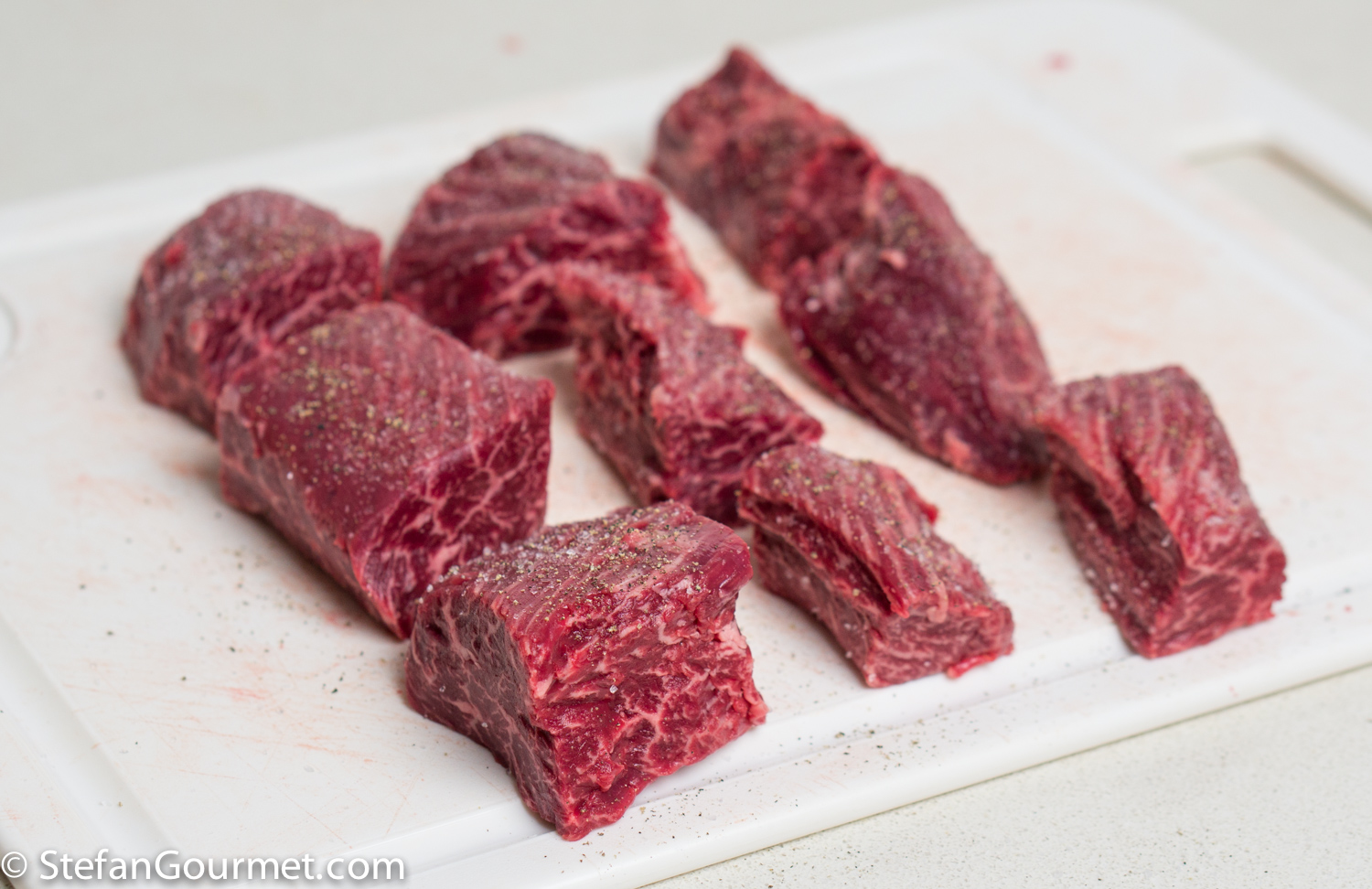 In this case, I removed the membrane and sliced the steak into medallions. I seasoned them with salt and freshly ground pepper.