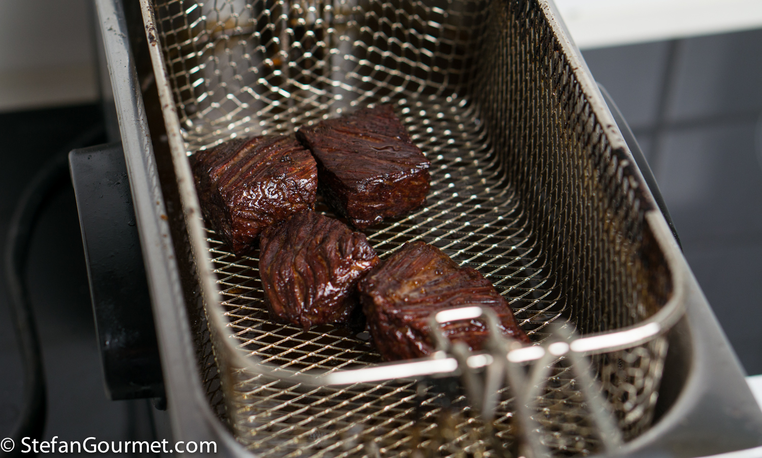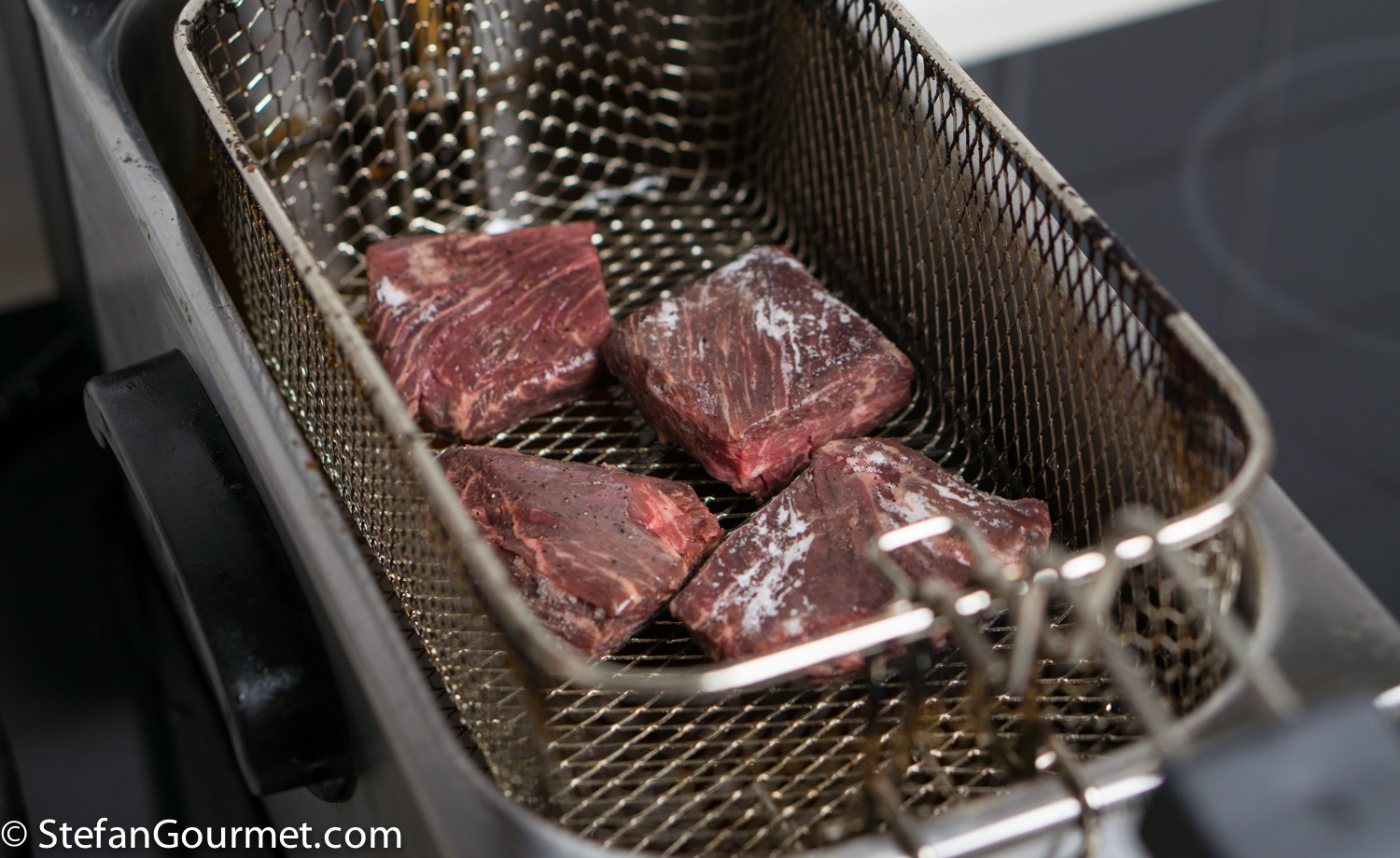 In cooking we often strive to combine a tender and juicy interior with a crispy and flavorful crust, which is an irresistible combination.  Sous-vide is a great way to cook the inside of a piece of meat, making it perfectly tender and juicy, but it doesn’t provide a crust. One of the options for putting a crust on a piece of meat that was cooked sous-vide, is deep frying. (This technique is also interesting if you don’t have sous-vide equipment, but in that case you can only use it for a very tender steak like beef tenderloin.)