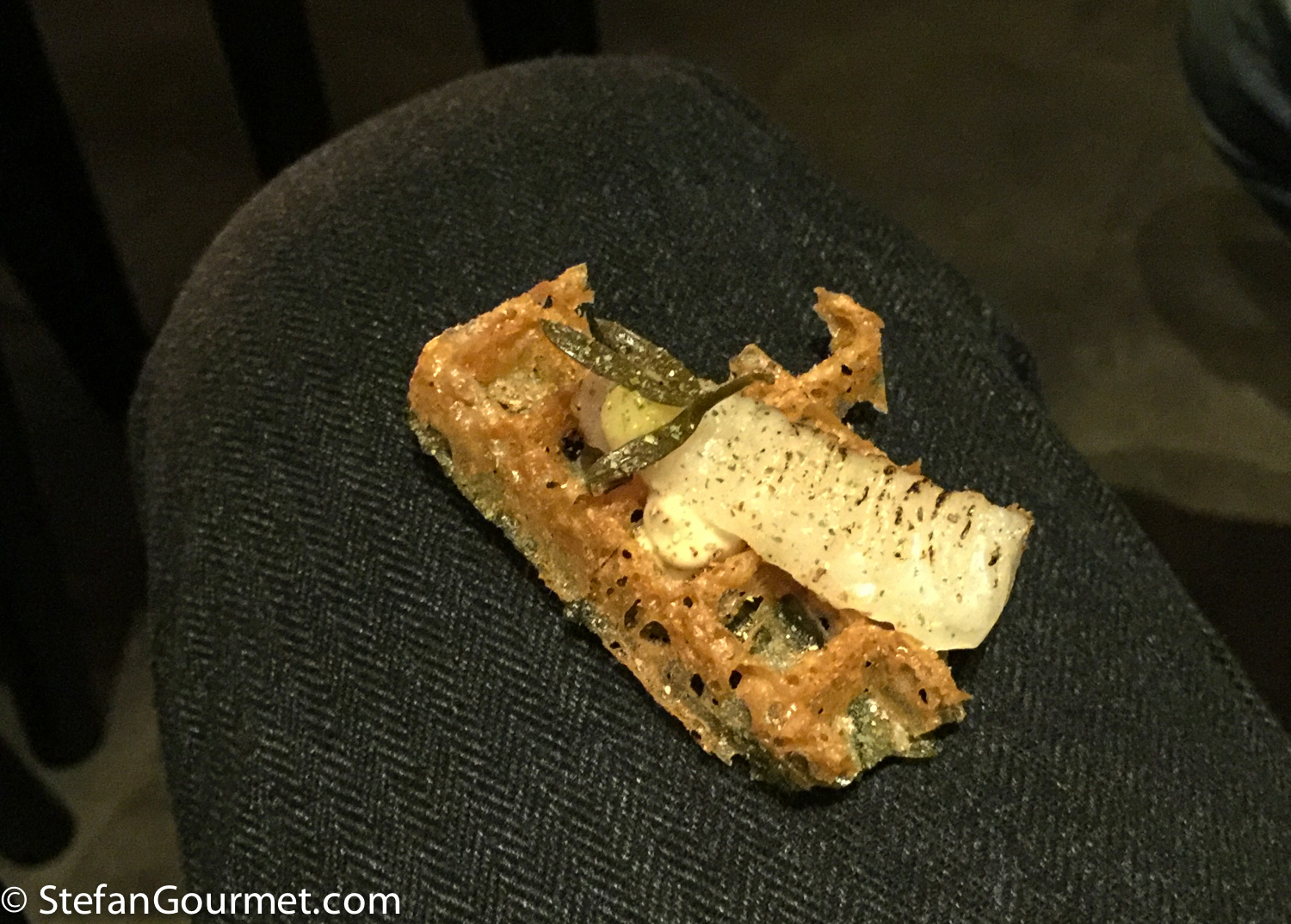 Third amuse bouche: a waffle with a piece of grilled halibut (which gets handed to you; I put it down on my knee to take the photo).