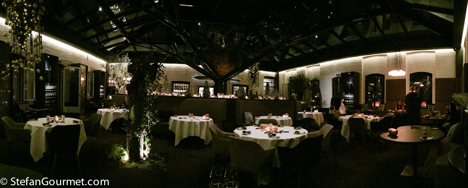 As from this year, the restaurant has moved from a separate location to the courtyard of the hotel, which has been covered with a glass roof. The new space is very nice, albeit a bit dark. The food on the plates is very pretty, but it is hard to see the colors because of the low lighting (not to mention difficult to photograph properly!). A very nice touch is that you can now see into the kitchen (in the old restaurant the kitchen was located in the basement) and that the kitchen staff comes out to serve the dishes.