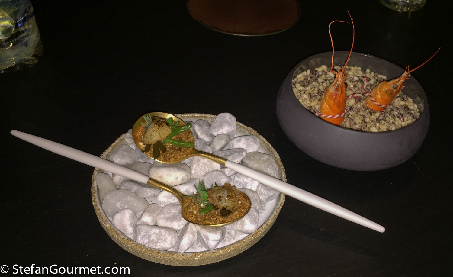 Fifth and sixth amuse bouche: cod cheek, grilled on a makeshift grill made from a can, and scampi.