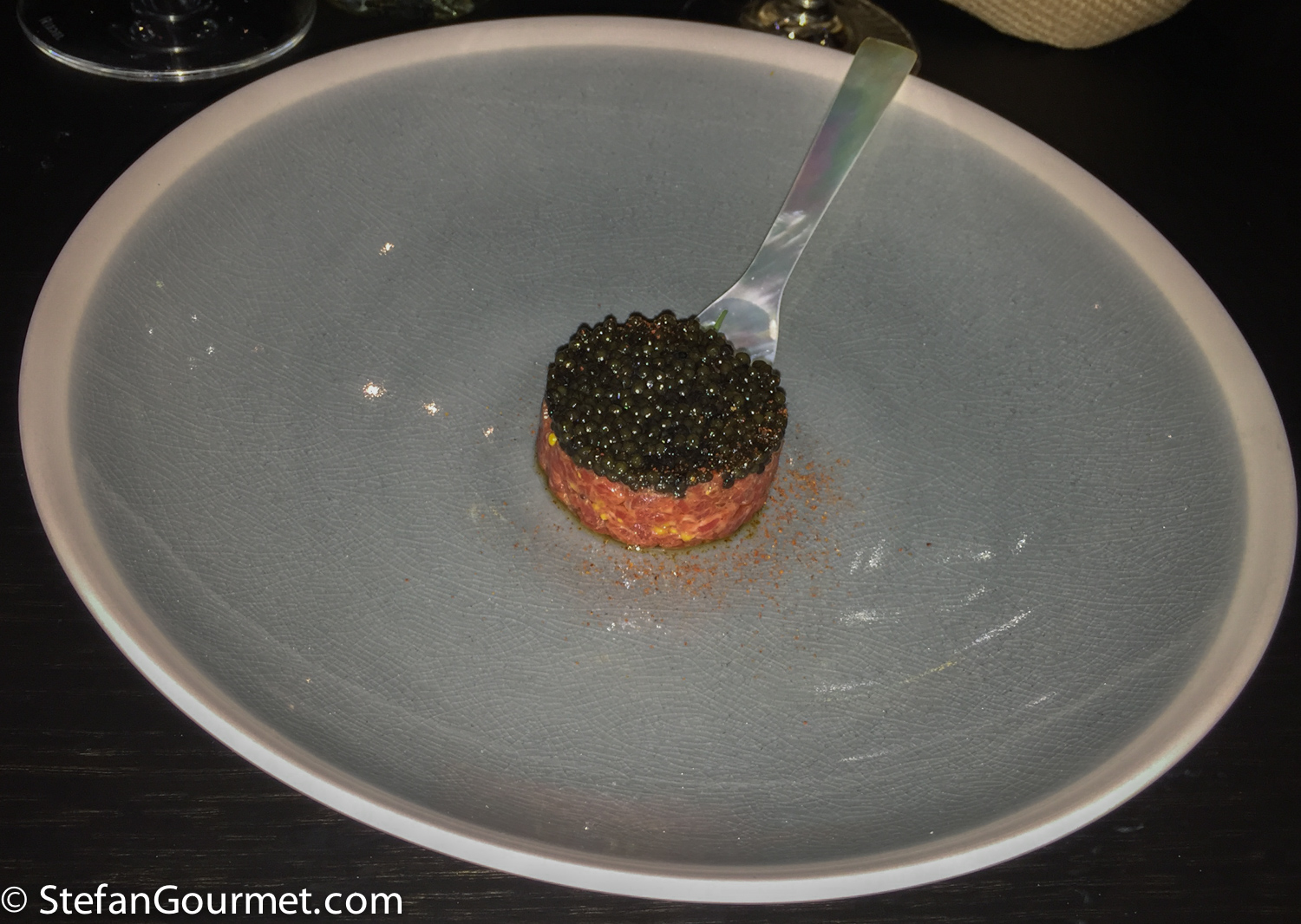 Fourth course: caviar and beef tartare with baharat, paired well with a 2006 vintage champagne. Simple but delicious. 10/10