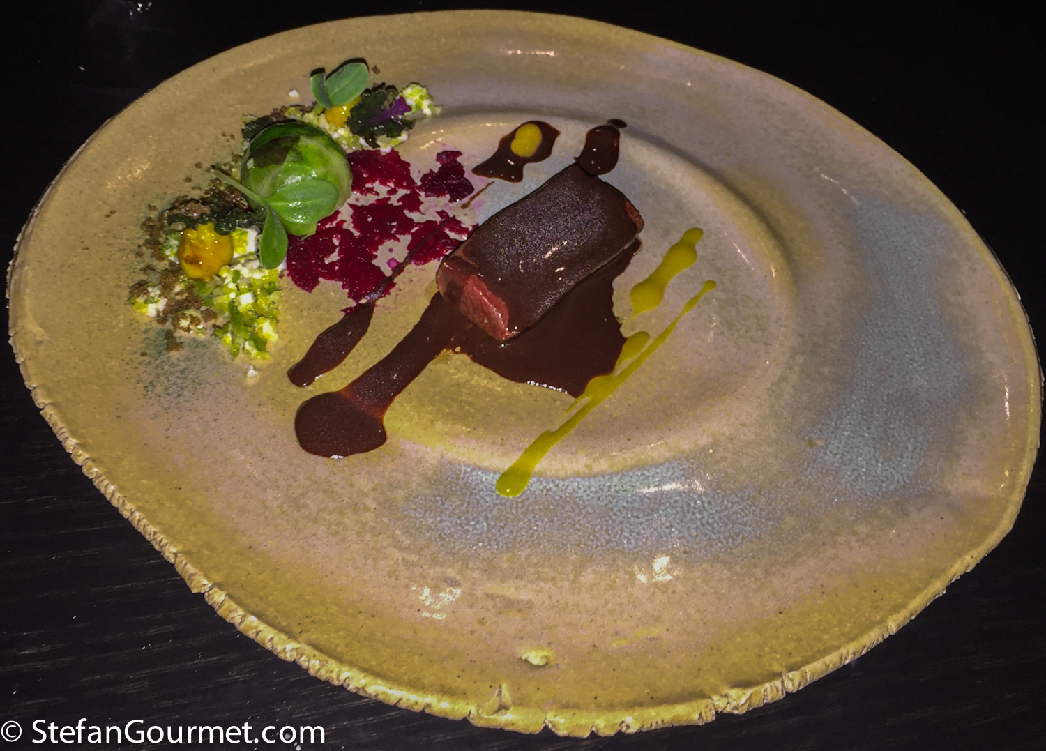 The alternative main course: hare loin with ‘sauce royale, beetroot and orange, paired well with a red from Portugal. A very nice dish, 9/10.