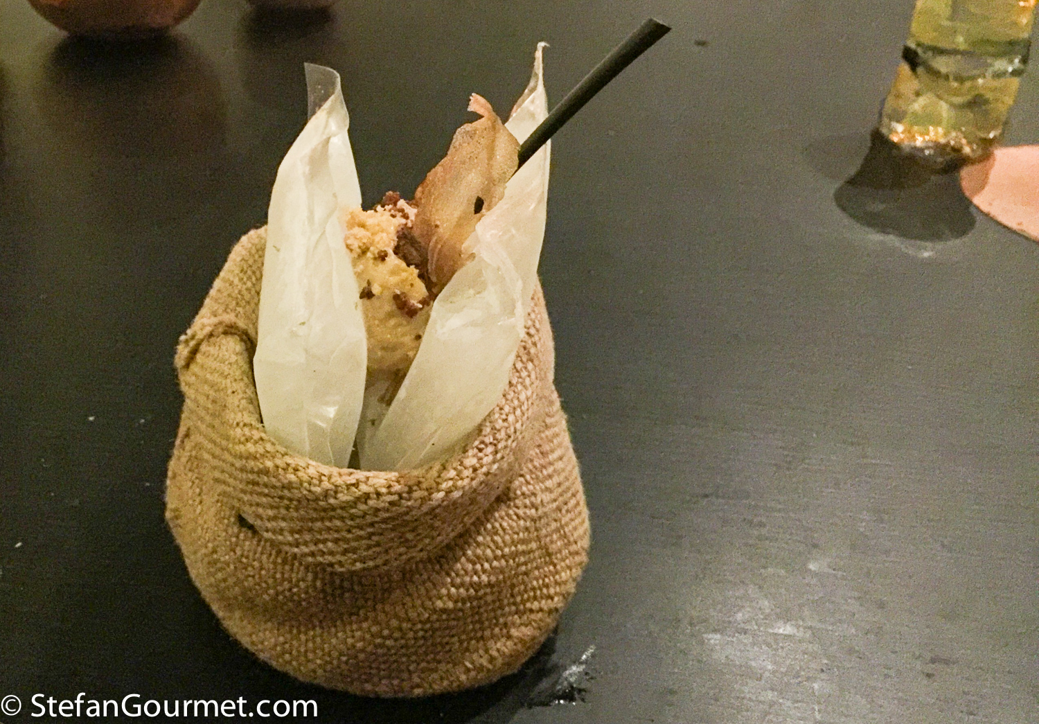 Second amuse bouche: a variation on the classic of pickle with peanut. To be honest I preferred the original as it had a special effect that you first tasted the pickle and then the peanut.