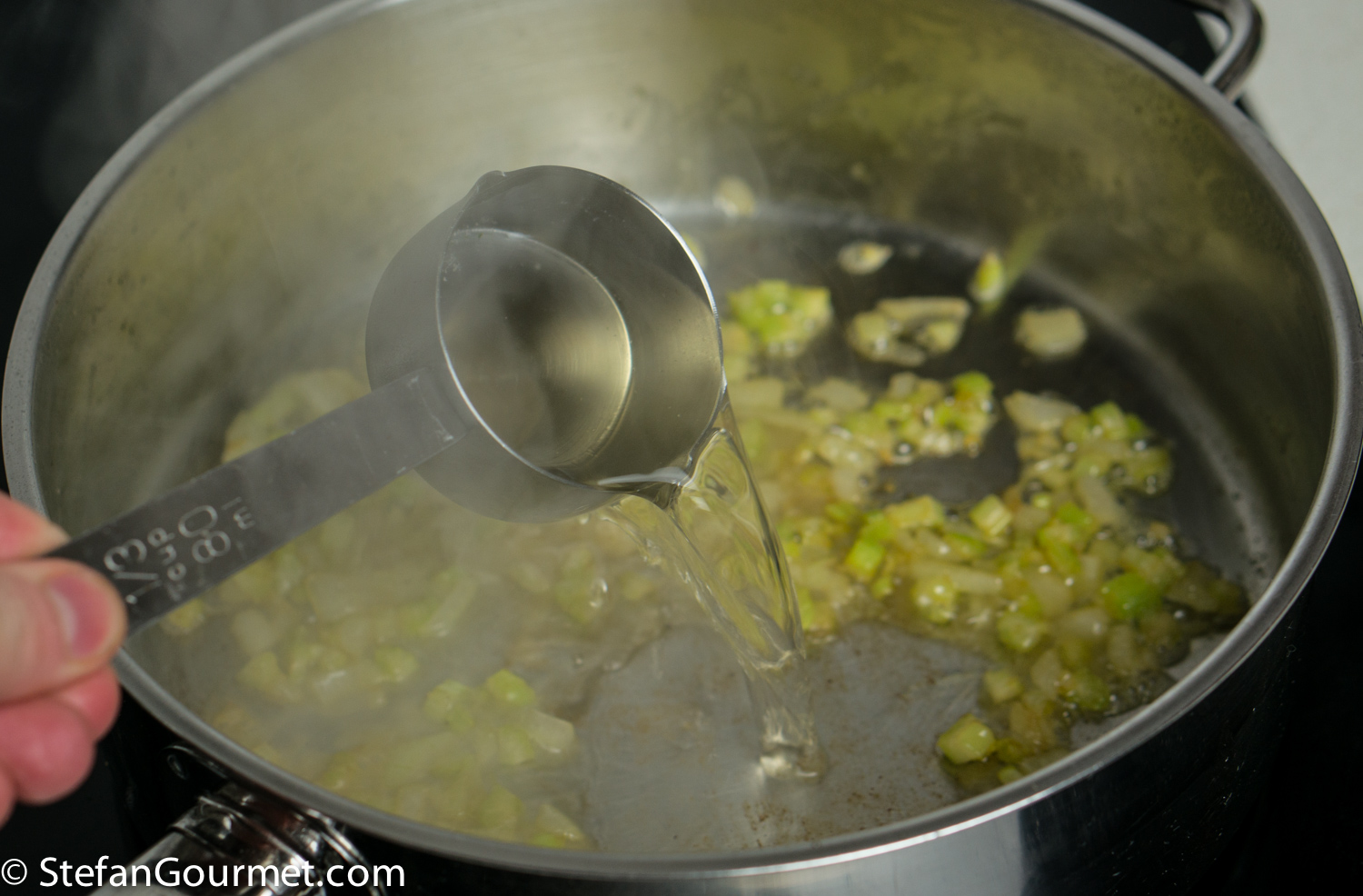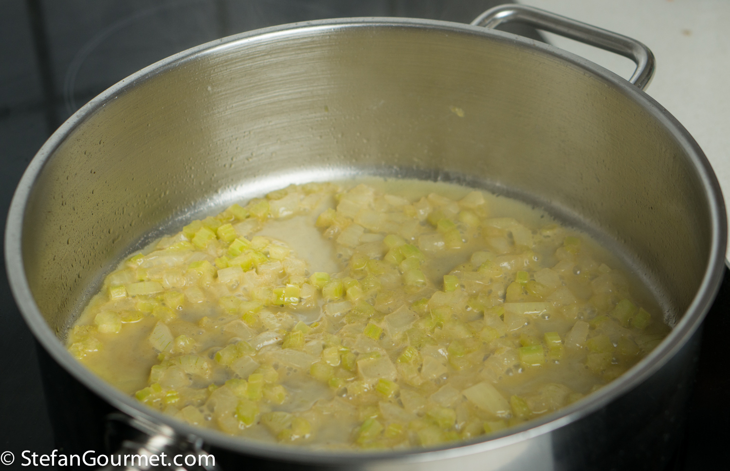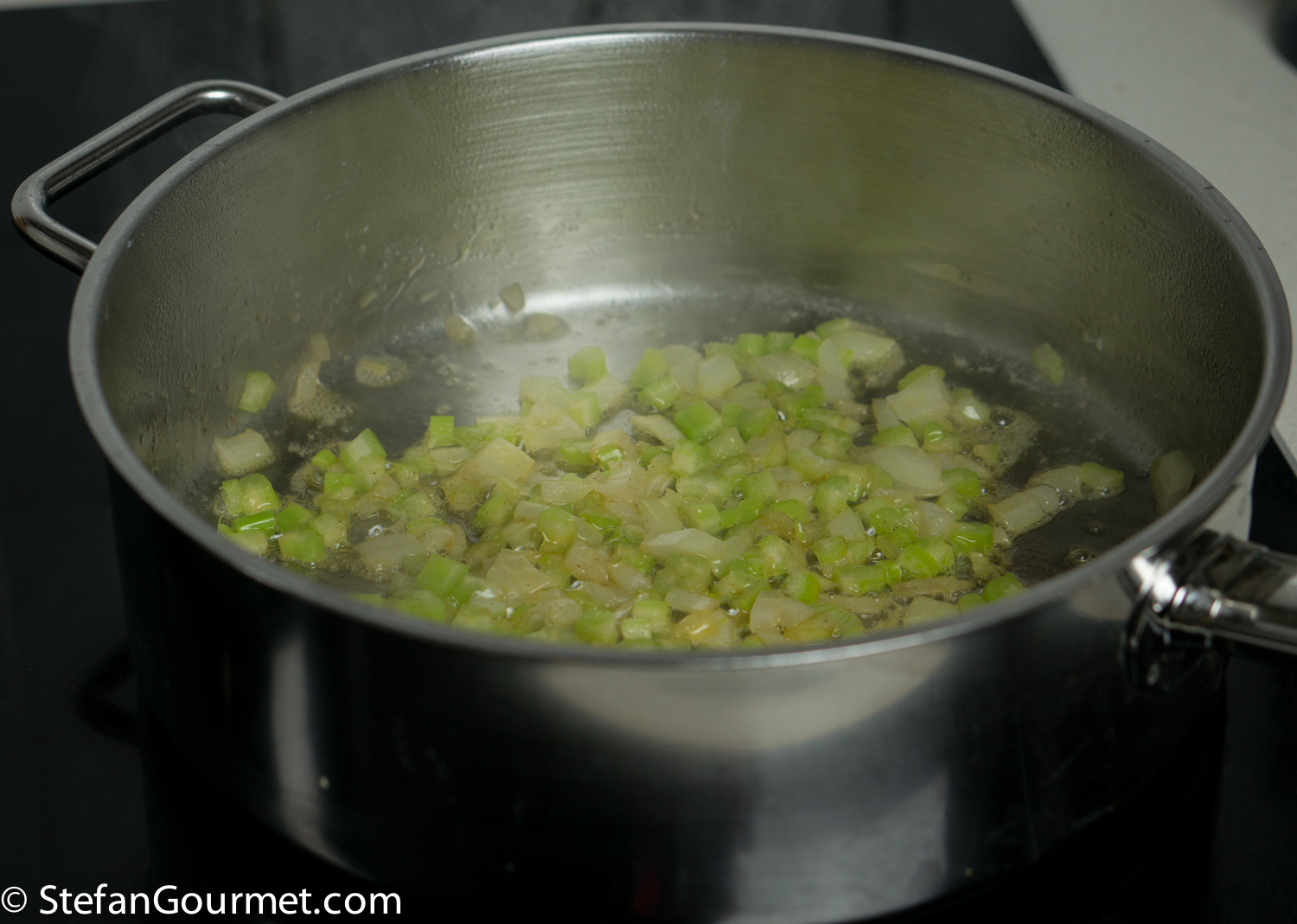 Melt 2 tablespoons of butter in a frying pan. Add a minced celery stalk and a minced half onion, and stir over medium heat until softened and golden.