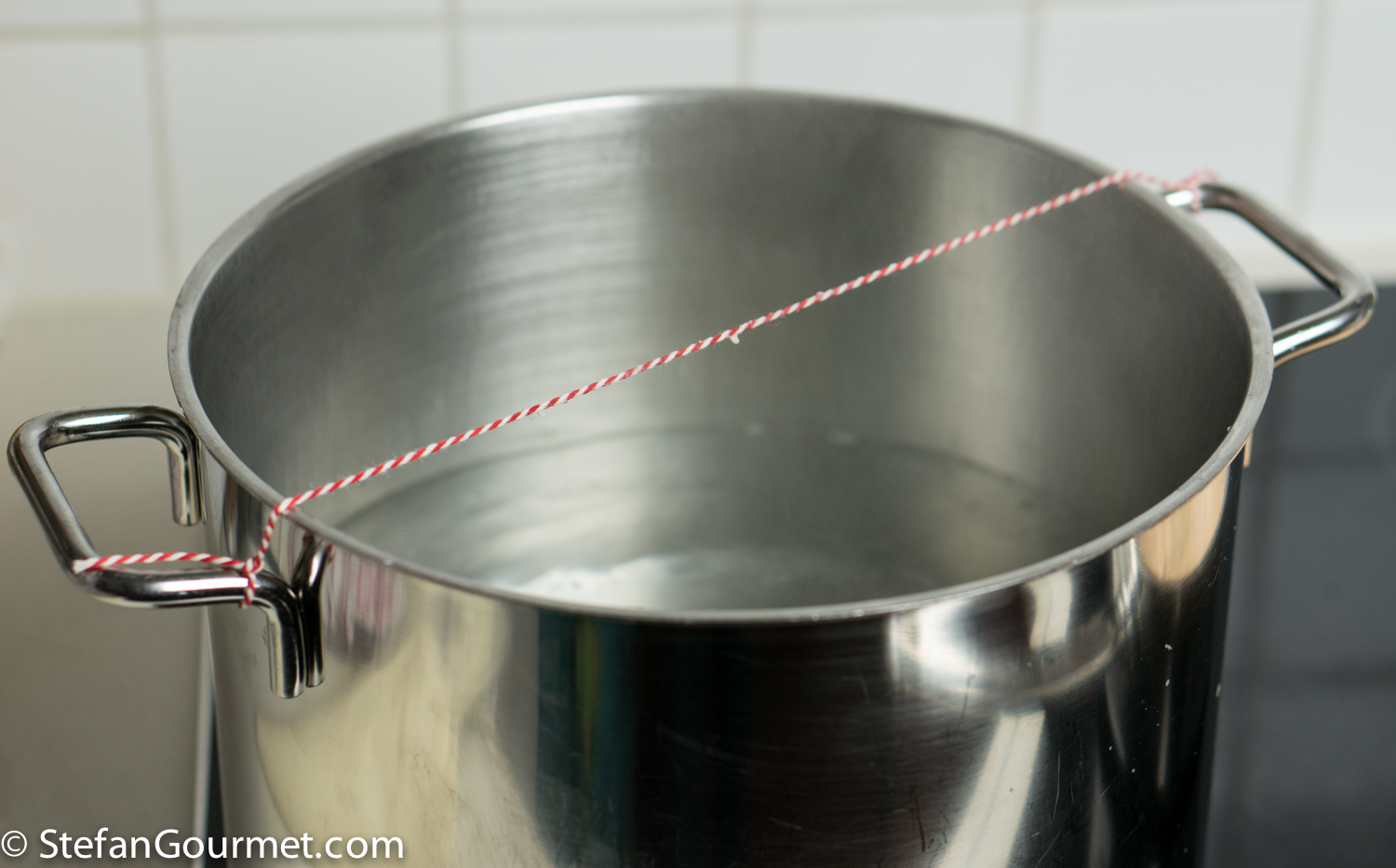 Bring a large pot of water to a boil. Tie a string across the top and make sure it is tight. Once the water boils, reduce the heat to a gentle boil.