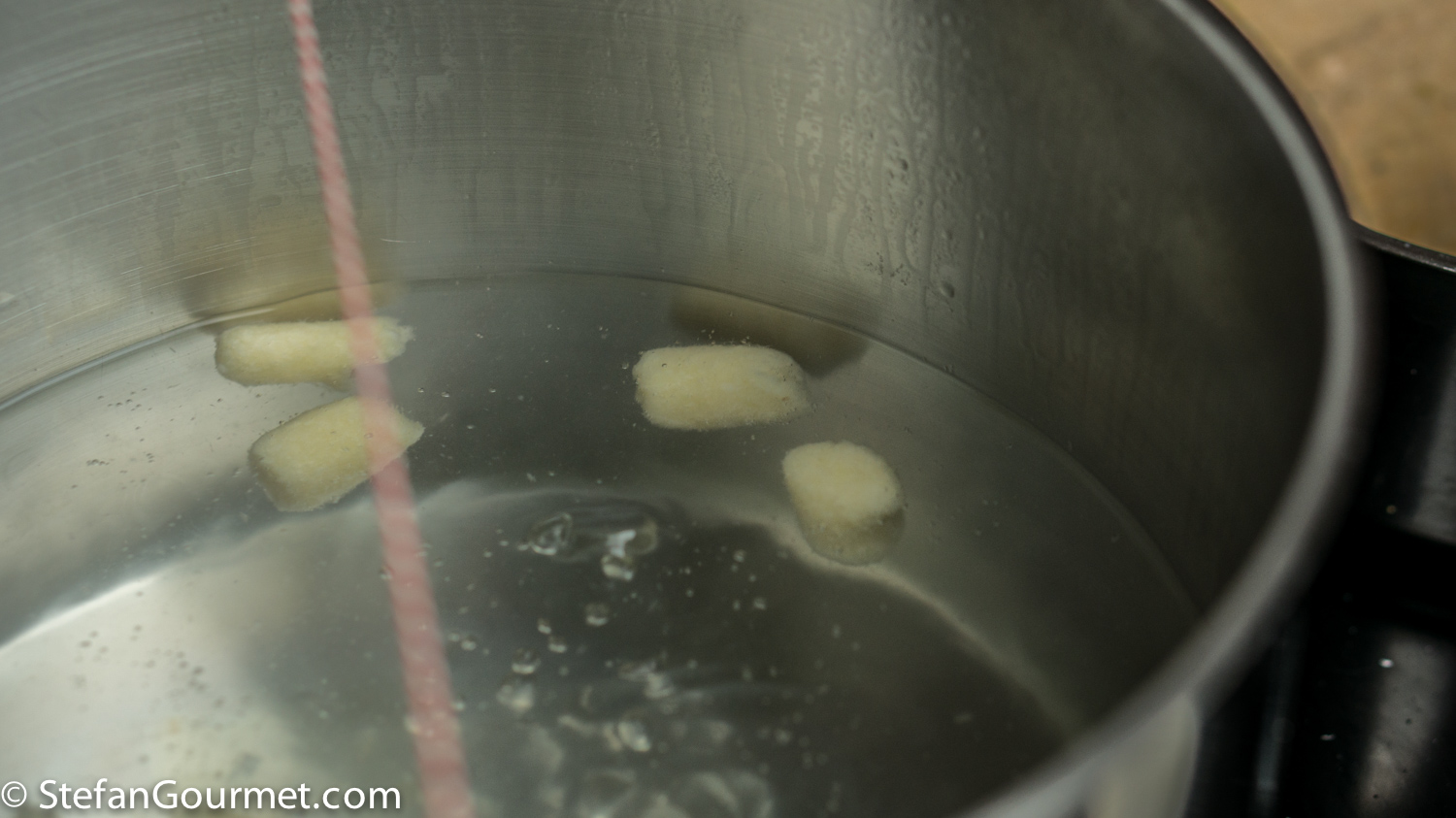 Squeeze gnocchi out of the piping bag and cut them with the wire, so that they fall into the boiling water.