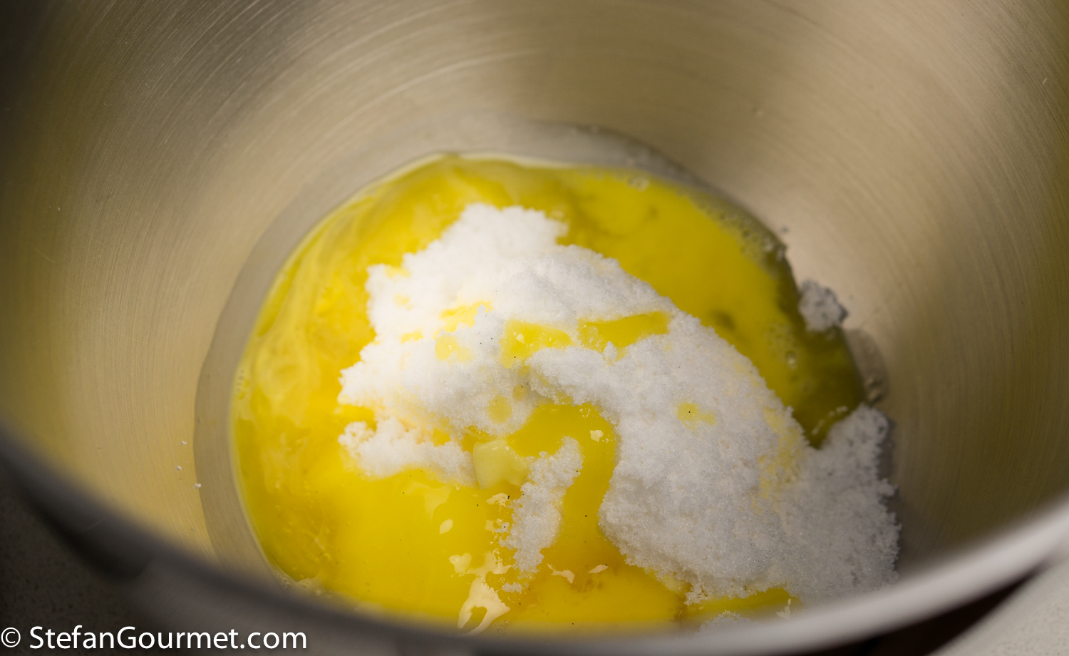 Combine 1 egg, 125 grams of butter, and 125 grams of sugar in the bowl of the mixer.