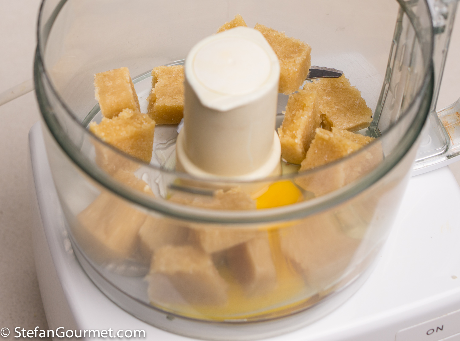 Combine 200 grams almond paste, broken into pieces, with an egg in a food processor.