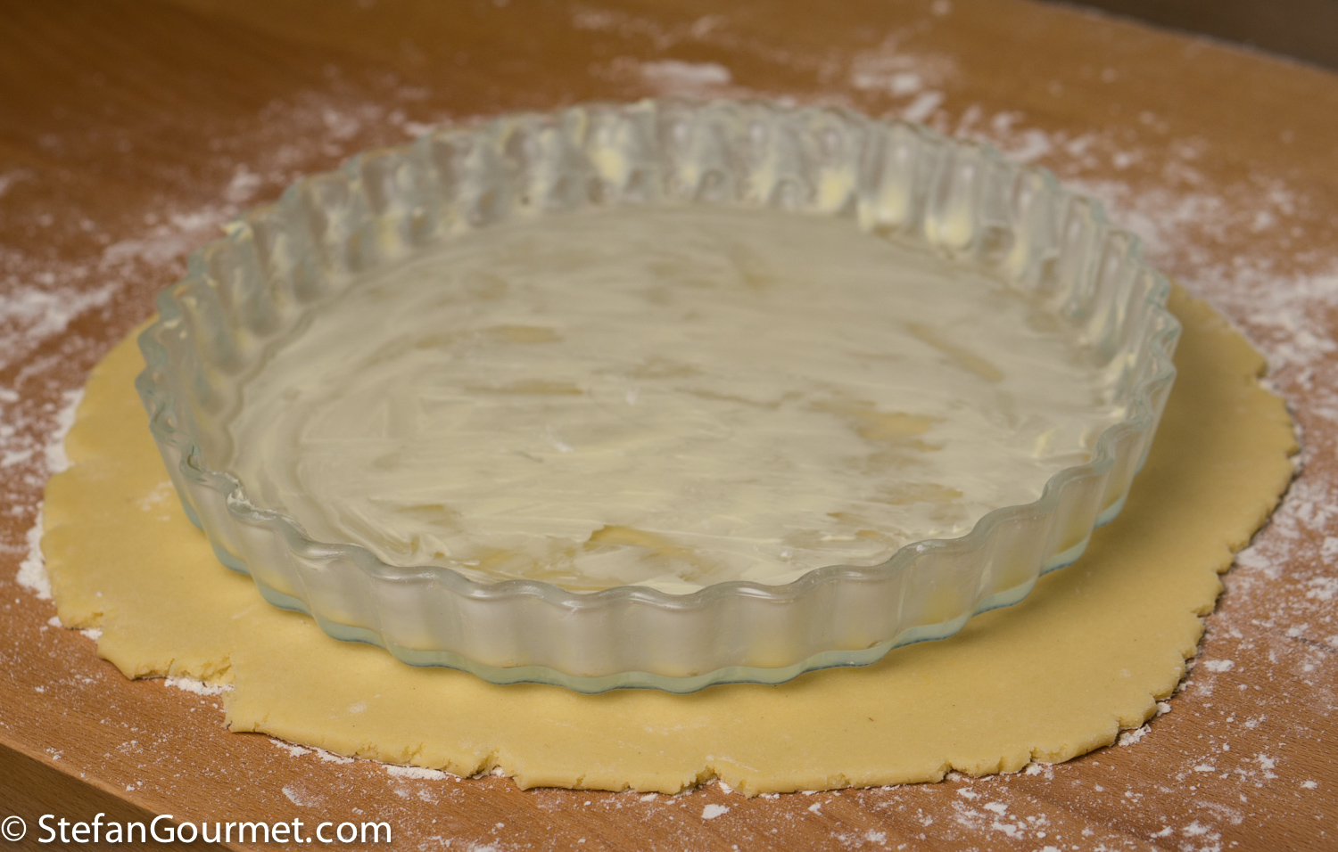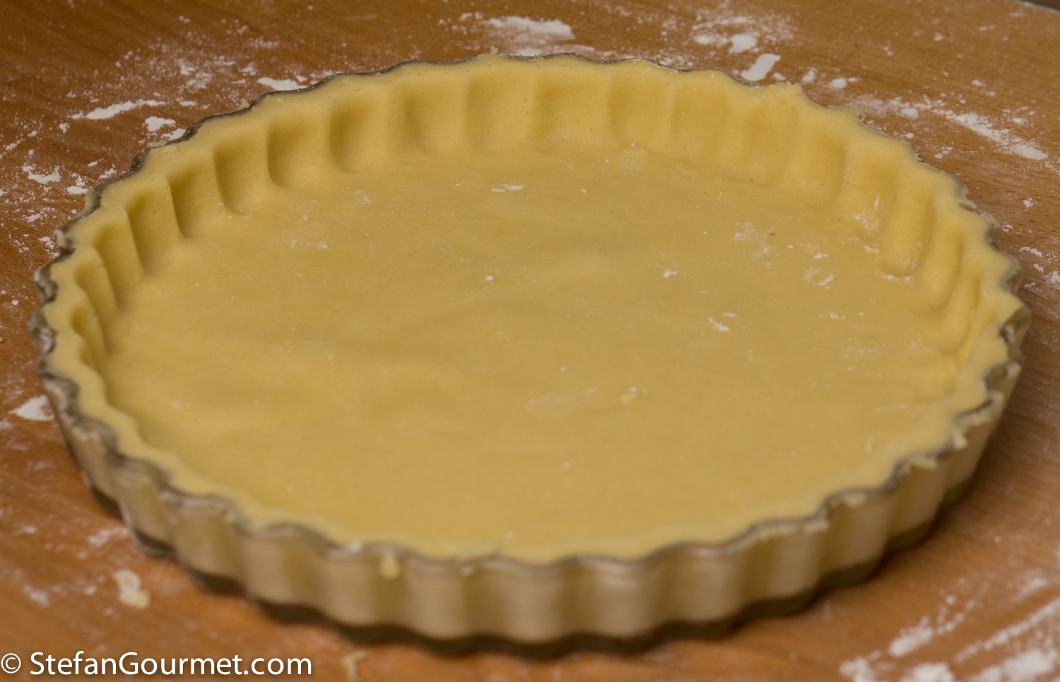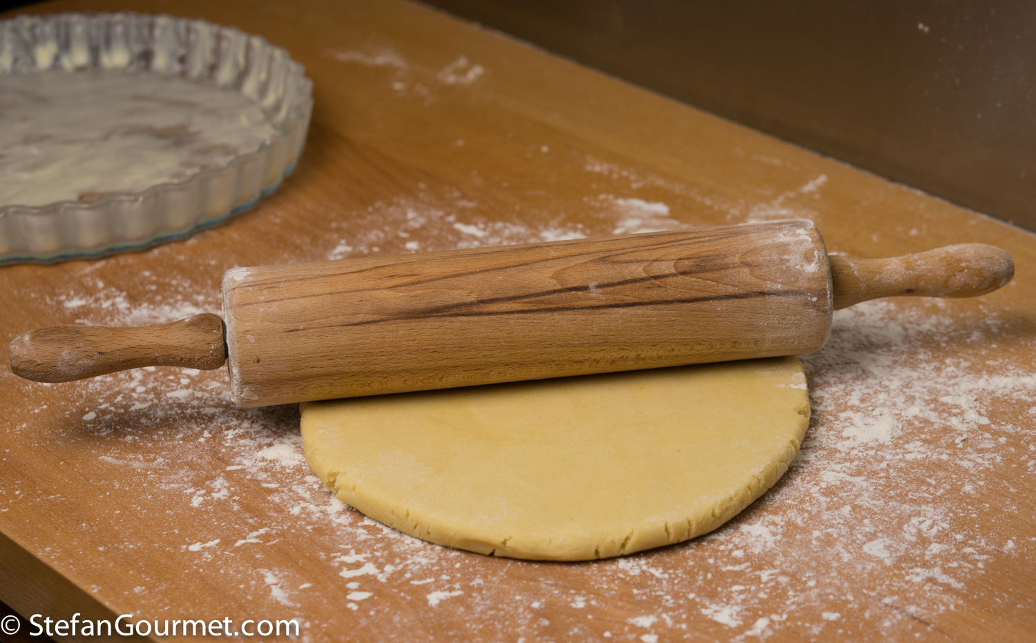 Roll it out to a circle that is large enough for the bottom and sides of the tart pan. To get a circle, using the rolling pin in different directions (including diagonal).
