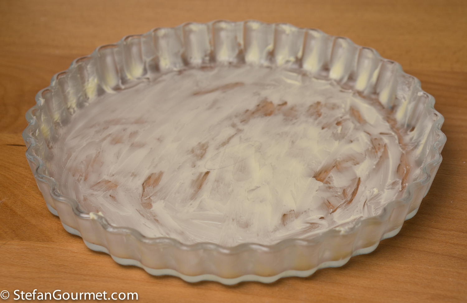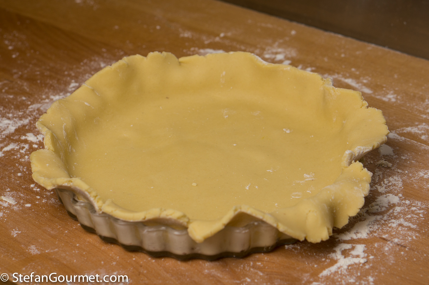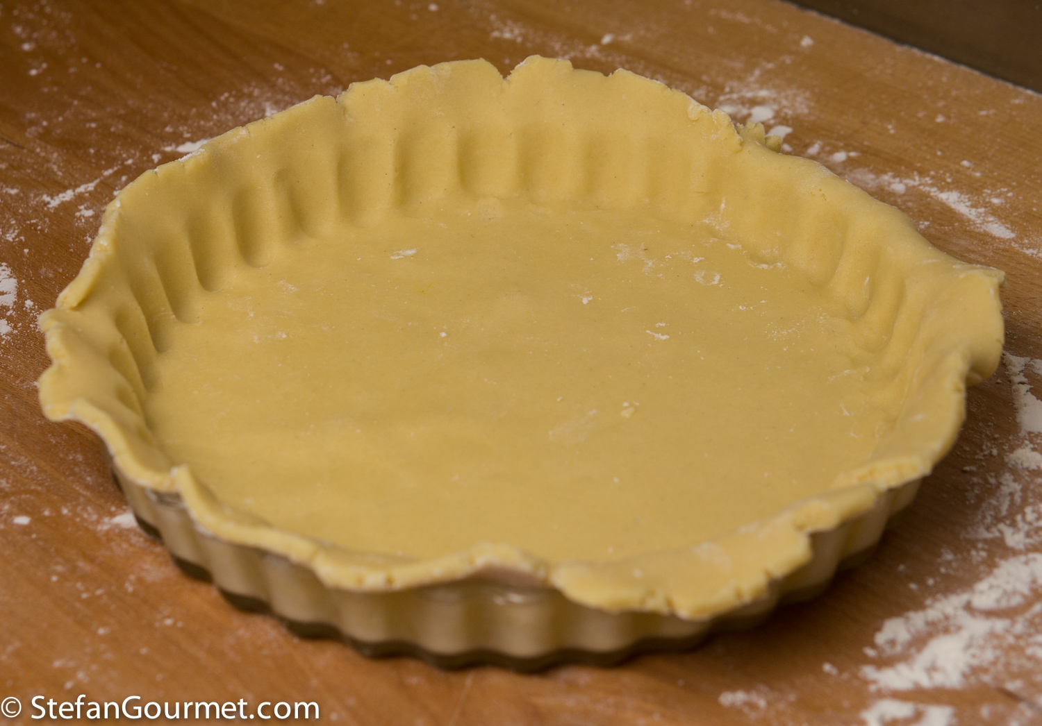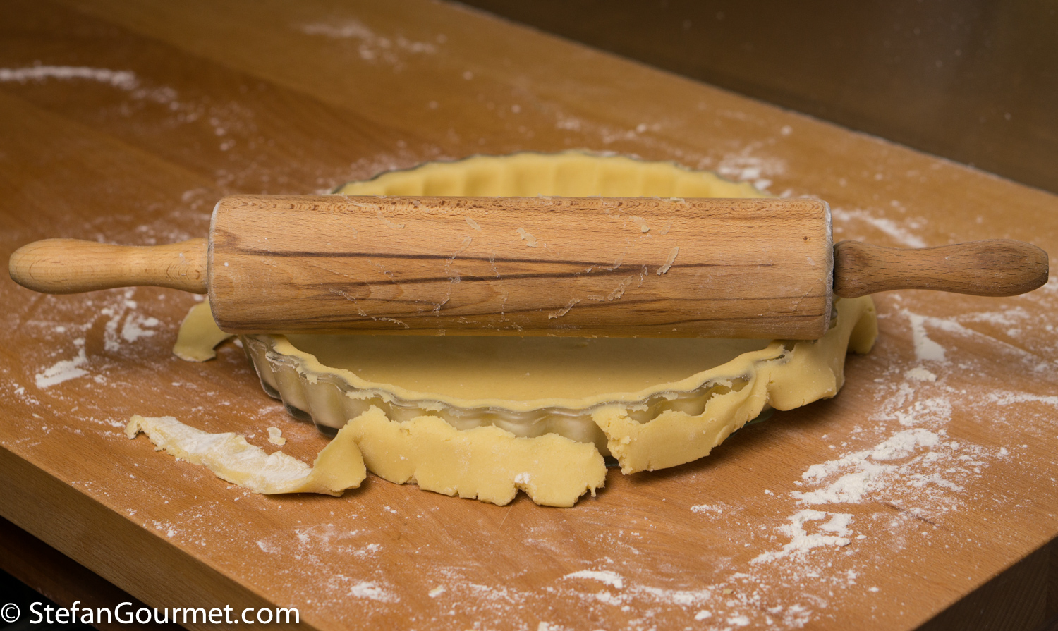 Roll it out to a circle that is large enough for the bottom and sides of the tart pan. To get a circle, using the rolling pin in different directions (including diagonal).