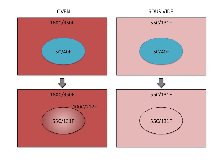 Read that last sentence again, because it is very important for understanding what is so different about sous-vide. If for example you cook a leg of lamb, a ham, or a whole chicken in the oven at 180C/350F, the core temperature will increase with time. The longer you leave it in, the hotter the core will become. This is why many recipes tell you to roast something until the core temperature reaches a certain value. At that time, the air around the roast will be 180C/350F, the outer layer of the roast will be close to 100C/212F, and the core will be whatever temperature you were aiming for (for example, 55C/131F), and the rest of the roast will be a ‘gradient’ between 55C/131F and 100C/212F. This means that the core of the meat will be perfectly cooked, but that the outer layers will be overcooked (and thus dry and less tender).