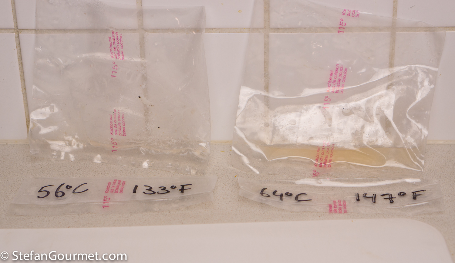 The reason why I called 56C/133F more tender than 64C/147F is mostly due to the juiciness. You can also see this in the picture: the low temp is more flexible and less contracted, which makes it appear more tender. The difference in tenderness is quite small, the juiciness is the main difference.