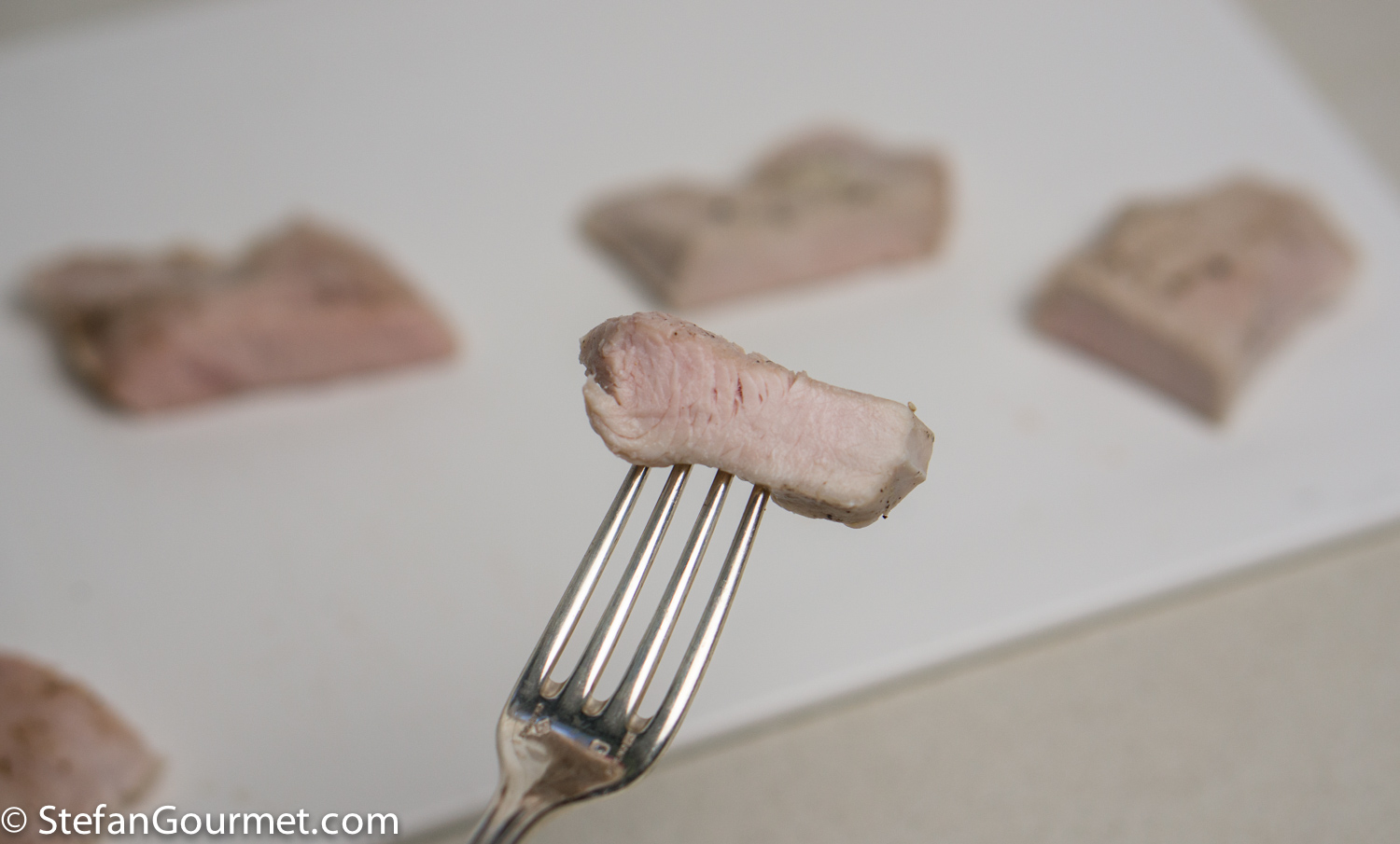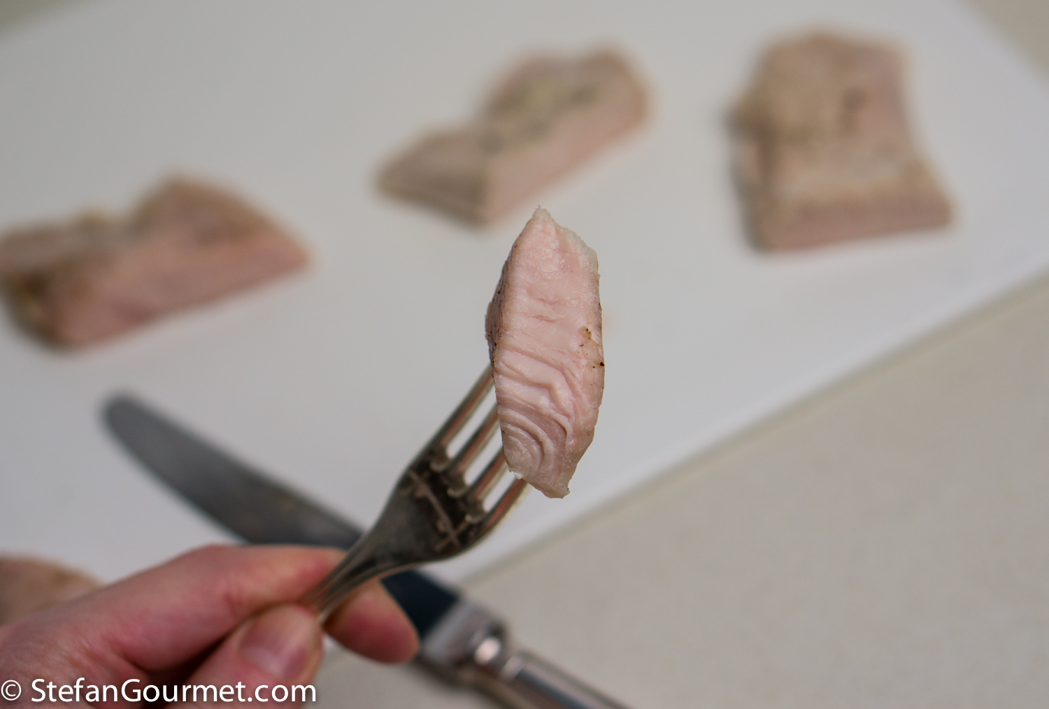I cooked one of those slices sous-vide for an hour at 56C/133F, and another slice for an hour at 64C/147F, as those are two temperature most commonly suggested for turkey breast sous-vide. Both time and temperature combinations are safe to eat for such thin slices (but a longer time would be needed at 56C/133F for a thicker slice).