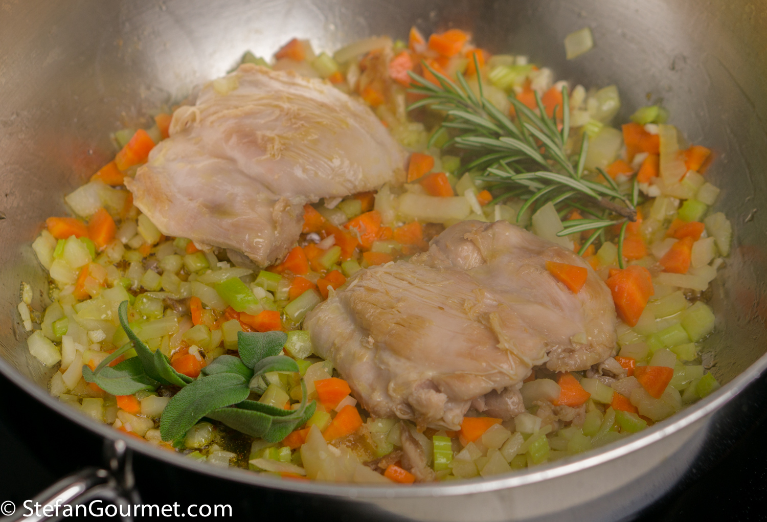 …add the onion, celery, carrot, garlic, sage, and rosemary. Stir until the vegetables start to color, about 5 minutes.