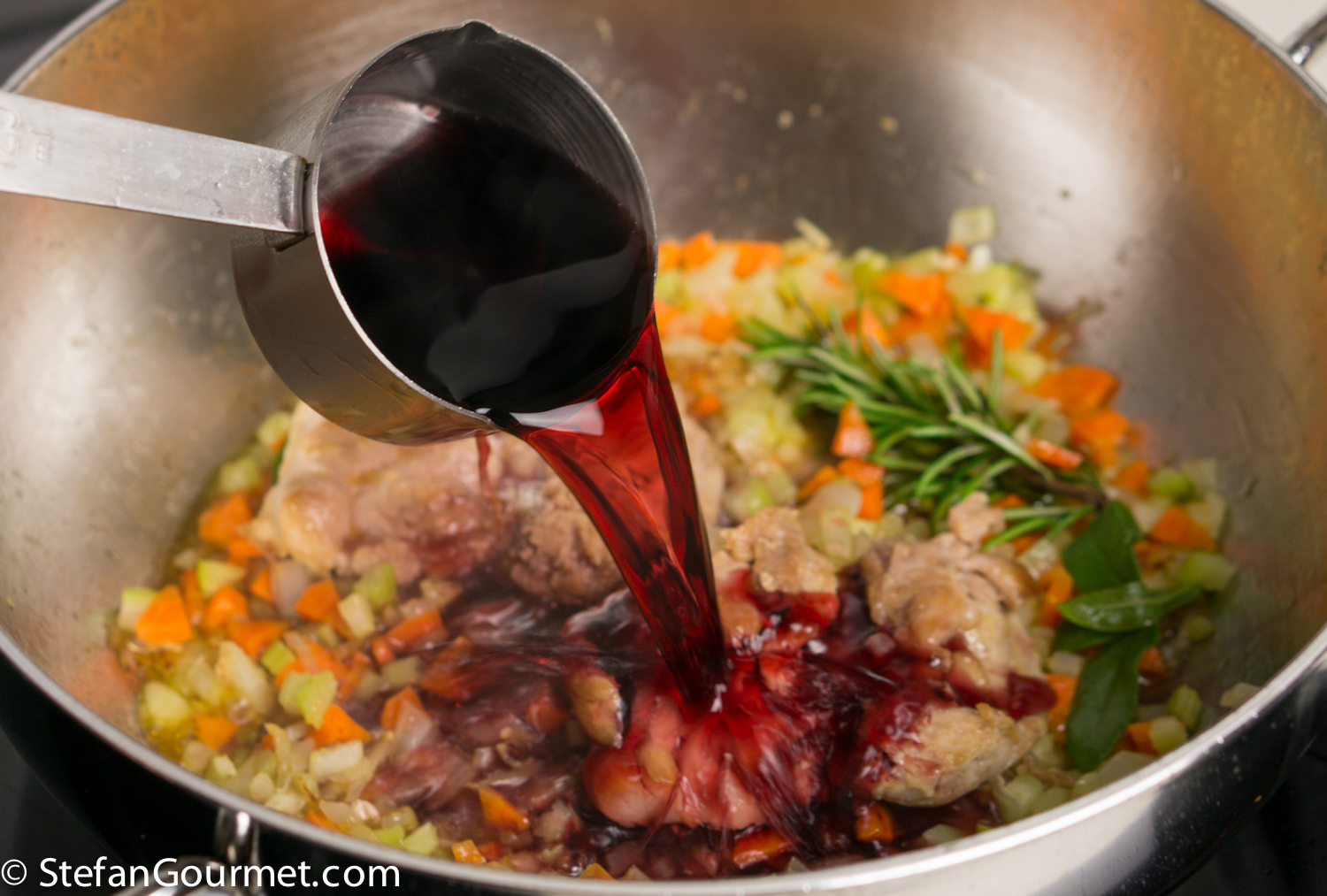 Deglaze the pan with 125 ml (1/2 cup) red wine.