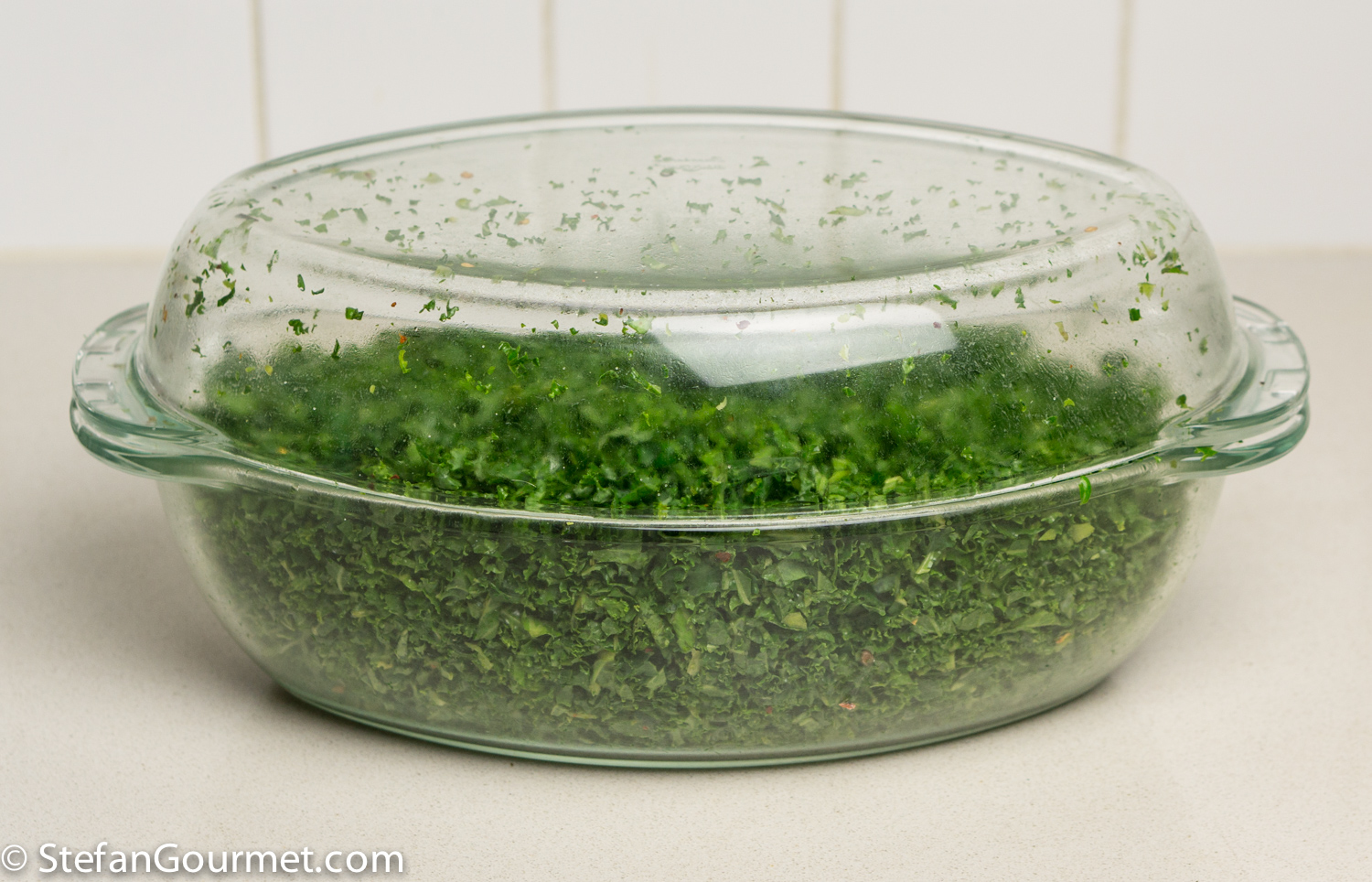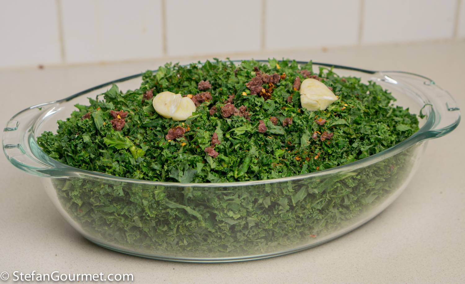 Preheat the oven to 120C/250F. Combine 300 grams (.66 lb) shredded kale with two flattened garlic cloves, 4 minced anchovy fillets, 1/4 tsp chilli flakes, 1/4 tsp salt, and 2 Tbsp olive oil in an oven proof dish with a cover.