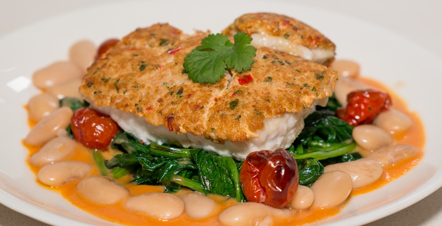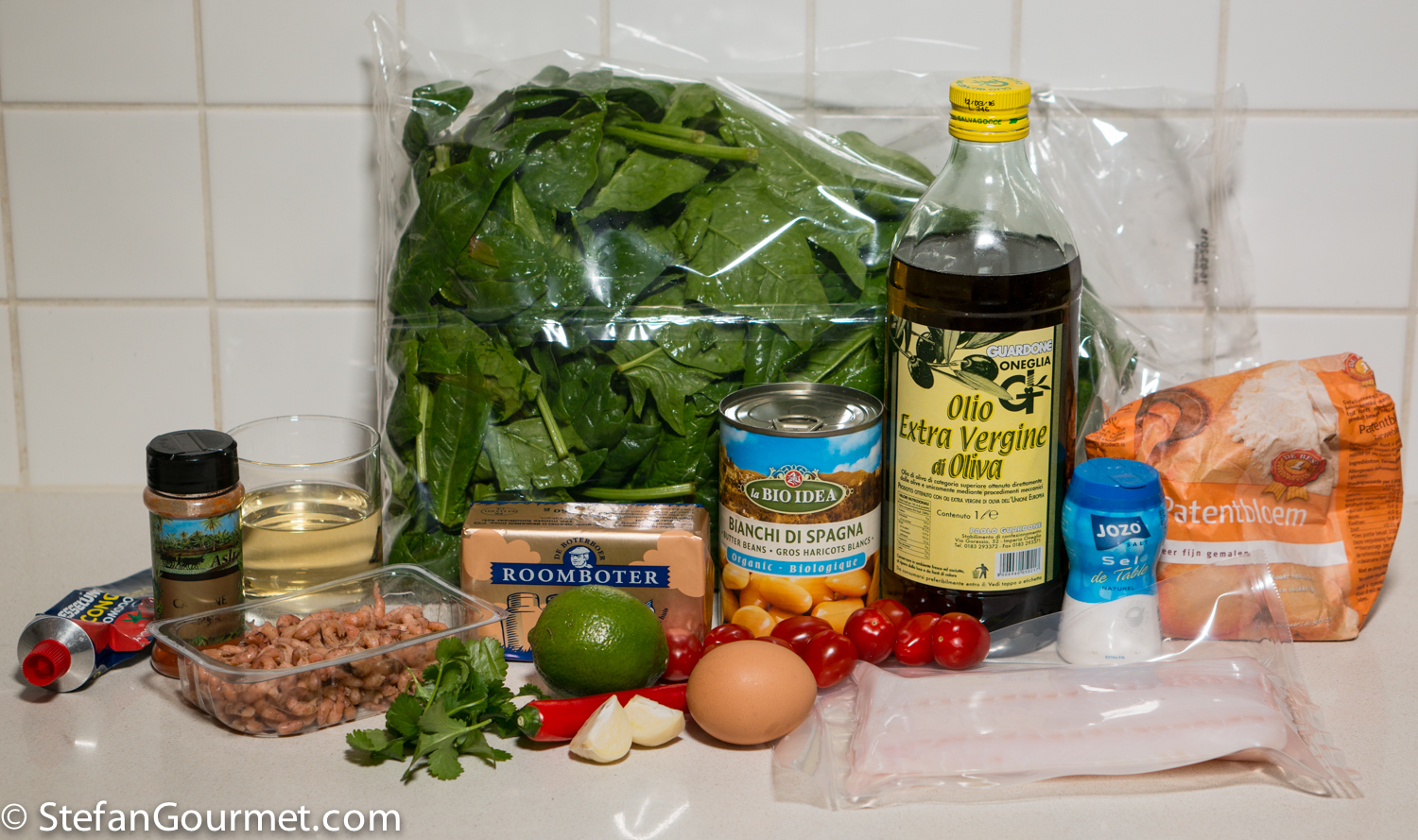 On Ocean Drive in Miami Beach I had a very nice dish at A Fish Called Avalon, crab-crusted grouper with steamed spinach, giant white beans, roasted teardrop tomatoes, and a madeira beurre blanc. This is the only dish from my recent trip to Florida that I liked so much that I wanted to try and make something similar at home. The first problem is that grouper is not available in the Netherlands. And so I opted for the quite similar wolffish, but halibut would work too. The second problem was that although crab is usually available, I couldn’t find any after I had already purchased the other ingredients. And so I chose North Sea shrimp instead. (These tiny shrimp are cooked fresh in seawater as soon as they are caught and have more flavor than their larger cousins. You can substitute with other shrimp, raw or cooked doesn’t matter much.) The end result was very nice, although I certainly wouldn’t claim it to be a copy of Avalon’s dish. Also because I made some other changes as well. There will be a follow-up post in which I will use crab as well as madeira.
